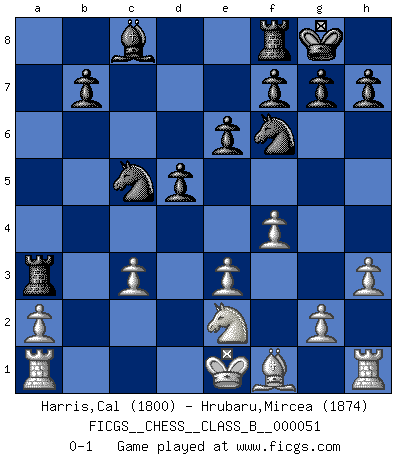 Last move : 0-1 2008 September 14 0:48:13 [Event "FICGS__CHESS__CLASS_B__000051"] [Site "FICGS"] [Date "2008.08.03"] [Round "1"] [White "Harris,Cal"] [Black "Hrubaru,Mircea"] [Result "0-1"] [WhiteElo "1800"] [BlackElo "1874"] 1.d4 Nf6 2.e3 d5 3.c3 c5 4.dxc5 e6 5.b4 a5 6.bxa5 Qxa5 7.Ne2 Nbd7 8.Ba3 Bxc5 9.Qc1 Bxa3 10.Nxa3 Qxa3 11.Qxa3 Rxa3 12.f4 O-O 13.h3 Nc5 0-1 Queen's pawn game Kingside Castling by player Black (move 12) Player Black won this chess game. Follow this game move after move (download)To avoid losing a piece, many a person has lost the game. (Savielly Tartakover) Wer wird heute Abend ihr Gegner sein? -- Heute Abend spiele ich gegen die schwarzen Steine. (Akiba Rubinstein) El Ajedrez es tortura mental. (Garry Kasparov) Des combinaisons [dans le jeu d'échecs] pareilles à des mélodies. Je crois entendre pour ainsi dire la musique des coups... (Vladimir Nabokov) The various flowers seem good to different people. (Chinese proverb)