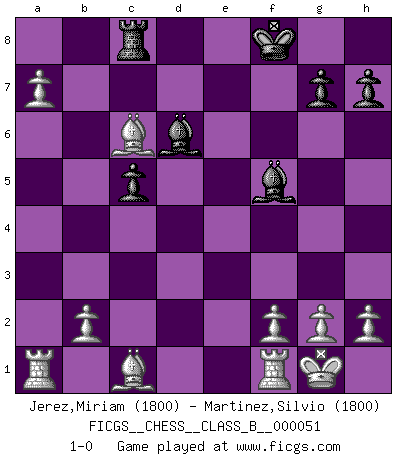 Last move : 1-0 2008 August 18 2:7:20 [Event "FICGS__CHESS__CLASS_B__000051"] [Site "FICGS"] [Date "2008.08.03"] [Round "1"] [White "Jerez,Miriam"] [Black "Martinez,Silvio"] [Result "1-0"] [WhiteElo "1800"] [BlackElo "1800"] 1.d4 d5 2.c4 dxc4 3.e4 c5 4.d5 e5 5.Nc3 f5 6.exf5 Bxf5 7.Nf3 Nf6 8.Qa4 Qd7 9.Qxd7+ Nbxd7 10.Be2 Nb6 11.O-O Nfxd5 12.Nxd5 Nxd5 13.Nxe5 b5 14.a4 Bd6 15.Nc6 a6 16.axb5 O-O 17.bxa6 Rfc8 18.Bxc4 Rxc6 19.Bxd5+ Kf8 20.Bxc6 Rc8 21.a7 1-0 QGA : 3.e4 Kingside Castling by player White (move 11) Kingside Castling by player Black (move 16) Player White won this chess game. Follow this game move after move (download)I'd rather have a Pawn than a finger. (Reuben Fine) Ich verlor meine Bürgerrechte, mein Gehalt wurde mir nicht mehr bezahlt und ich wurde zensiert und durfte nicht mehr ins Ausland reisen. [nach dem Match Fischer-Taimanov 6:0] (Mark Taimanov) Realmente no sabemos como el juego fue inventado, aunque hay sospechas. Tan pronto como descubramos a los culpables, se los haremos saber. (Bruce Pandolfini) Le jeu d'échecs fait naître et fortifie en nous plusieurs qualités précieuses dans le cours de l'existence, telles que la prévoyance, la circonspection, la prudence, et la persévérance. (Benjamin Franklin - 1783, la morale des échecs) All battles are fought by scared men who'd rather be someplace else. (John Wayne in the movie In harm's way)