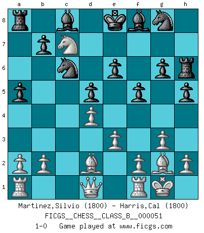 Last move : 1-0 2008 August 14 11:13:41 [Event "FICGS__CHESS__CLASS_B__000051"] [Site "FICGS"] [Date "2008.08.03"] [Round "1"] [White "Martinez,Silvio"] [Black "Harris,Cal"] [Result "1-0"] [WhiteElo "1800"] [BlackElo "1800"] 1.d4 d6 2.c4 f5 3.Nf3 a5 4.e3 e6 5.Nc3 h5 6.g3 g6 7.Bg2 c6 8.O-O d5 9.cxd5 cxd5 10.Ne5 Rh6 11.Bd2 Qd6 12.Nb5 Qc6 13.Nxc6 Nxc6 14.Nc7+ 1-0 Old Indian defense Kingside Castling by player White (move 8) Player White won this chess game. Follow this game move after move (download)I give 98 percent of my mental energy to Chess. Others give only 2 percent. (Bobby Fischer) Wenn sie aufgeben, dann danke ich Ihnen für das Spiel (Eventualzug beim Fernschach). (Anonymous) Debemos de asegurarnos de que el Ajedrez no se convierta en un lenguaje muerto, muy interesante, pero tan solo para un grupo muy pequeño. (Sytze Faber) On peut tirer plus d'utilité d'une partie perdue que de 100 parties gagnées. (Capablanca) Don't anthropomorphize computers - they hate it. (Anonymous)