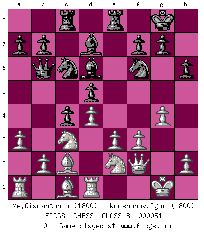 Last move : 1-0 2008 November 13 9:0:24 [Event "FICGS__CHESS__CLASS_B__000051"] [Site "FICGS"] [Date "2008.08.03"] [Round "1"] [White "Me,Gianantonio"] [Black "Korshunov,Igor"] [Result "1-0"] [WhiteElo "1800"] [BlackElo "1800"] 1.d4 Nf6 2.c4 e6 3.Nc3 Bb4 4.e3 O-O 5.Bd3 d5 6.cxd5 exd5 7.Nge2 Re8 8.O-O Bd6 9.f3 c5 10.Qe1 Nc6 11.Qh4 h6 12.g4 Bd7 13.Qf2 Rc8 14.a3 Qb6 15.Rd1 c4 16.Bc2 1-0 Nimzo-Indian : 4.e3 O-O, 5.Bd3 d5 Kingside Castling by player Black (move 4) Kingside Castling by player White (move 8) Player White won this chess game. Follow this game move after move (download)It is not enough to be a good player... you must also play well. (Siegbert Tarrasch) Ich trinke, ich rauche, ich spiele, ich liebe Frauen aber Fernschach ist ein Laster, das ich nicht habe. (Mikhail Nekhemyevich Tal) Cuando tengas duda... ¡juega al Ajedrez!. (Tevis) Aux échecs, les retours au sommet sont rares : les dommages psychologiques consécutifs à une défaite sont trop sévères. (Daily Telegraph) As a goal marker shodan is important. As a destination it is a poor place to stop. (Thomas Tamayo)