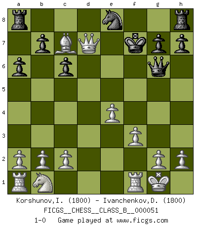 Last move : 1-0 2008 August 29 15:49:32 [Event "FICGS__CHESS__CLASS_B__000051"] [Site "FICGS"] [Date "2008.08.03"] [Round "1"] [White "Korshunov,Igor"] [Black "Ivanchenkov,Denis"] [Result "1-0"] [WhiteElo "1800"] [BlackElo "1800"] 1.e4 e5 2.Nf3 Nc6 3.Bb5 a6 4.Bxc6 dxc6 5.O-O Bd6 6.d4 f6 7.dxe5 fxe5 8.Nxe5 Qf6 9.Nd3 Qg6 10.Nf4 Bxf4 11.Bxf4 Bd7 12.Bxc7 Nf6 13.Qd6 Kf7 14.f3 Ne8 15.Qxd7+ 1-0 Ruy Lopez : Exchange variation, 5.O-O Kingside Castling by player White (move 5) Player White won this chess game. Follow this game move after move (download)Capture of the adverse King is the ultimate but not the first object of the game. (William Steinitz) Schach ist Krieg, im Schach geht es um testosterongesteuerte Urschreie. (Garry Kasparov) El Ajedrez es sobre todo, ¡una pelea!. (Emanuel Lasker) RxDa4 pat (...) He who fights with monsters should be careful lest he thereby become a monster. (Friedrich Nietzsche, Beyond Good and Evil)