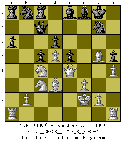 Last move : 1-0 2009 January 25 23:28:38 [Event "FICGS__CHESS__CLASS_B__000051"] [Site "FICGS"] [Date "2008.08.03"] [Round "1"] [White "Me,Gianantonio"] [Black "Ivanchenkov,Denis"] [Result "1-0"] [WhiteElo "1800"] [BlackElo "1800"] 1.d4 g6 2.c4 Nf6 3.Nc3 Bg7 4.e4 d6 5.Nge2 c5 6.d5 O-O 7.Ng3 Re8 8.h4 h5 9.Be2 Bg4 10.f3 Bc8 11.Nf1 e6 12.a4 exd5 13.cxd5 a6 14.a5 b5 15.axb6 Qxb6 16.Nd2 Bd7 17.Nc4 Qc7 18.Bf4 Bf8 19.Kf2 Rd8 20.e5 Ne8 21.Bg5 Rc8 22.e6 fxe6 23.Qc2 Ng7 24.Qxg6 Be8 25.Qe4 e5 26.Bd3 1-0 Modern defense Kingside Castling by player Black (move 6) Player White won this chess game. Follow this game move after move (download)I have always a slight feeling of pity for the man who has no knowledge of Chess. (Siegbert Tarrasch) Herr Iljumschinow ist ein etwas merkwürdiger Geschäftsmann: Er arbeitet zusammen mit Leuten wie Muammar al-Gaddafi; früher ist das Saddam Hussein gewesen. (Joel Lautier) Todos los Maestros de Ajedrez fueron un día unos principiantes. (Chernev) Psychologiquement, tu dois avoir confiance en toi même, mais cette confiance doit être basée sur des faits. (Robert Fischer) In every real man a child is hidden that wants to play. (Friedrich Nietzsche)