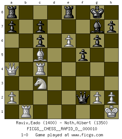 Last move : 1-0 2008 August 12 16:24:19 [Event "FICGS__CHESS__RAPID_D__000010"] [Site "FICGS"] [Date "2008.08.03"] [Round "1"] [White "Raviv,Eado"] [Black "Noth,Albert"] [Result "1-0"] [WhiteElo "1400"] [BlackElo "1350"] 1.e4 d6 2.d4 g6 3.f4 Bg7 4.c4 Nf6 5.Nc3 O-O 6.Nf3 Bg4 7.Be2 Bxf3 8.Bxf3 Nc6 9.e5 dxe5 10.fxe5 Nd7 11.O-O f6 12.e6 Nb6 13.c5 Nc4 14.Bxc6 bxc6 15.Kh1 f5 16.Qa4 Qxd4 17.Rf4 Qxc5 18.Rxc4 Qf2 19.Bg5 Qxb2 20.Rb1 Qf2 21.Bxe7 Rfe8 22.Bc5 1-0 King's pawn Opening Kingside Castling by player Black (move 5) Kingside Castling by player White (move 11) Player White won this chess game. Follow this game move after move (download)Chess is war over the board. The object is to crush the opponents mind. (Bobby Fischer) Ohne Leiden bildet sich kein Charakter. (Ernst Freiherr von Feuchtersleben) A la fecha, Fischer esta simplemente un nivel arriba de todos los mejores jugadores de Ajedrez del mundo. (John Jacobs) En blitz, le Cavalier l'emporte sur le Fou. (Vlastimil Hort) My poor ole parrot... Is not in the circulation of displays ....poo hoo hoo :) (Wayne Lowrance's enigma)