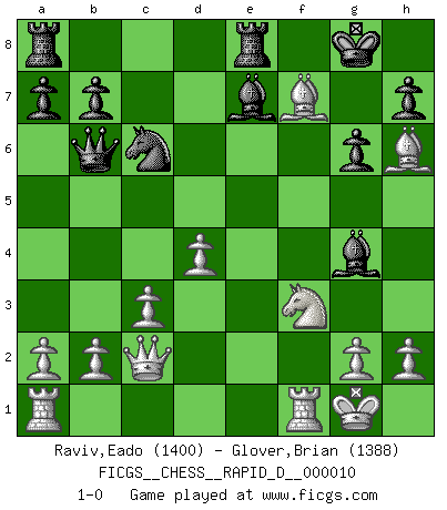 Last move : 1-0 2008 September 1 11:44:7 [Event "FICGS__CHESS__RAPID_D__000010"] [Site "FICGS"] [Date "2008.08.03"] [Round "1"] [White "Raviv,Eado"] [Black "Glover,Brian"] [Result "1-0"] [WhiteElo "1400"] [BlackElo "1388"] 1.e4 e5 2.Nc3 Bc5 3.f4 exf4 4.Nf3 d5 5.Nxd5 Nf6 6.d4 Nxd5 7.exd5 Be7 8.Bxf4 O-O 9.Bc4 Bg4 10.O-O c6 11.dxc6 Nxc6 12.c3 Qb6 13.Qc2 g6 14.Bh6 Rfe8 15.Bxf7+ 1-0 Vienna game Kingside Castling by player Black (move 8) Kingside Castling by player White (move 10) Player White won this chess game. Follow this game move after move (download)Life is like a game of Chess, changing with each move. (Chinese proverb) Als ich elf wurde, wurde ich einfach gut. (Robert James Fischer) Una partida de Ajedrez se divide en 3 etapas: la primera cuando piensas que tienes la ventaja, la segunda cuando crees que tienes la ventaja y la tercera... ¡cuando te das cuenta que vas a perder!. (Savielly Tartakower) Le succès, c'est être capable d'aller d'échec en échec sans perdre son enthousiasme. (Winston Churchill) The only thing that matters is the evidence. (Horatio Caine, C.S.I. Miami)