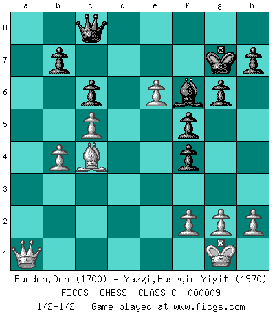 Last move : 1/2-1/2 2006 December 17 1:24:16 [Event "FICGS__CHESS__CLASS_C__000009"] [Site "FICGS"] [Date "2006.08.01"] [Round "1"] [White "Burden,Don"] [Black "Yazgi,Huseyin Yigit"] [Result "1/2-1/2"] [WhiteElo "1700"] [BlackElo "1970"] 1.e4 c5 2.Nf3 e6 3.d4 cxd4 4.Nxd4 a6 5.c4 Nf6 6.Nc3 Qc7 7.Bd3 Nc6 8.Nxc6 dxc6 9.O-O e5 10.Qe2 Be6 11.a3 Be7 12.b4 O-O 13.c5 a5 14.Na4 axb4 15.axb4 Rfd8 16.Be3 Nh5 17.Nb6 Rxa1 18.Rxa1 Nf4 19.Bxf4 exf4 20.e5 Rd4 21.Nc4 Bxc4 22.Bxc4 g6 23.e6 f5 24.Ra8+ Rd8 25.Qa2 Kg7 26.Rxd8 Qxd8 27.Qa7 Qc8 28.Qa1+ Bf6 1/2-1/2 Sicilian : Kan, Maroczy bind (Reti variation) Kingside Castling by player White (move 9) Kingside Castling by player Black (move 12) This chess game ended in a draw. Follow this game move after move (download)Best by test: 1. e4 (Bobby Fischer) Fischer machte Schach einfach zu einer aufregenden Sache, wann immer er sich ans Brett setzte. (Raymond Keene) La belleza de un movimiento no se refleja solo en su apariencia, sino en el pensamiento detrás de él. (Siegbert Tarrasch) Un journaliste : 'Vous préférez avoir une dame de plus sur l'échiquier ou au lit ?' Boris Spassky : 'Ca dépend de la position.' God is an atheist. (Unknown)