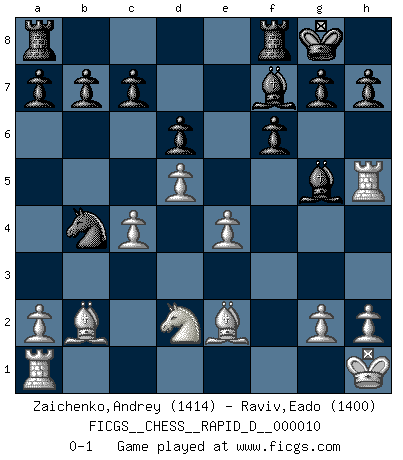 Last move : 0-1 2008 September 6 17:43:39 [Event "FICGS__CHESS__RAPID_D__000010"] [Site "FICGS"] [Date "2008.08.03"] [Round "1"] [White "Zaichenko,Andrey"] [Black "Raviv,Eado"] [Result "0-1"] [WhiteElo "1414"] [BlackElo "1400"] 1.b4 e5 2.Bb2 f6 3.e4 Bxb4 4.Bc4 Ne7 5.Qh5+ Ng6 6.f4 exf4 7.Nh3 Qe7 8.O-O Qc5+ 9.Qxc5 Bxc5+ 10.d4 Bb6 11.Nxf4 Nxf4 12.Rxf4 d6 13.Kh1 Nc6 14.c3 Na5 15.Bd3 O-O 16.Nd2 Be6 17.c4 Nc6 18.d5 Be3 19.Rh4 Nb4 20.Be2 Bg5 21.Rh5 Bf7 0-1 Polish (Sokolsky) opening Kingside Castling by player White (move 8) Kingside Castling by player Black (move 15) Player Black won this chess game. Follow this game move after move (download)Excellence at Chess is one mark of a scheming mind. (Sir Arthur Conan Doyle) Unter Putin wird alles Geld aus Russland wie von einem Staubsauger nach Moskau umgeleitet, das ist wie ein schwarzes Loch. (Garry Kasparov) Para mi, el Ajedrez es la vida y cada partida es como una nueva vida. Todo jugador de Ajedrez suele vivir muchas vidas durante su vida. (Eduard Gufeld) J'apprécie les joueurs d'est-indienne, c'est grâce à eux que je nourris ma famille depuis tant d'années. (Petrosian) Man is reluctant to give credit for intelligence to anyone, except his enemies. (Albert Einstein)