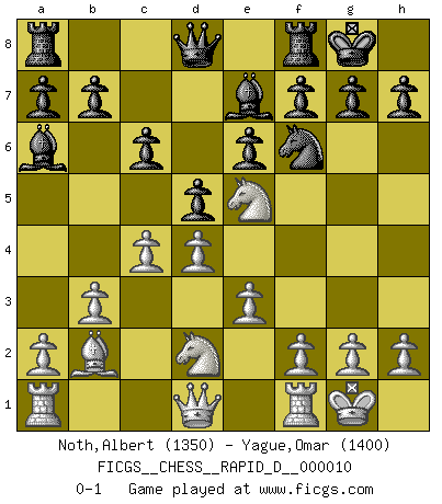 Last move : 0-1 2008 September 22 22:20:45 [Event "FICGS__CHESS__RAPID_D__000010"] [Site "FICGS"] [Date "2008.08.03"] [Round "1"] [White "Noth,Albert"] [Black "Yague,Omar"] [Result "0-1"] [WhiteElo "1350"] [BlackElo "1400"] 1.b3 Nf6 2.Bb2 d5 3.e3 e6 4.Nf3 Be7 5.d4 Nc6 6.Bb5 Bd7 7.Nbd2 O-O 8.Bxc6 Bxc6 9.Ne5 Bb5 10.c4 Ba6 11.O-O c6 0-1 This chess game has been lost on time (started : 2008.08.03 18:3:27) Nimzovich-Larsen attack : Indian variation Kingside Castling by player Black (move 7) Kingside Castling by player White (move 11) Player Black won this chess game. Follow this game move after move (download)Let the perfectionist play postal. (Yasser Seirawan) Mutter, ich bin eben Ex-Weltmeister geworden. --beim nach Hause Kommen nach dem Verlust des WM-Titels an Mihail Botvinnik -- (Mikhail Nekhemyevich Tal) La vida es como un juego de Ajedrez, cambiando con cada movimiento. (Proverbio Chino) Roi des jeux et jeu des rois, les échecs portent en eux un sentiment d'infini. Ils donnent à celui qui s'est efforcé d'en approfondir les arcanes l'impression de n'être pas à la mesure de l'homme; en fait, ils constituent un résumé de l'univers, un microcosme, et figurent cette grande échelle qui, dans les plans de la lumière descend jusqu'à la matière, qui des abîmes insondables remonte jusqu'en l'infini de Dieu. (Pyrame) You must have a dream in order to have it come true. (A.P.J. Kalam)