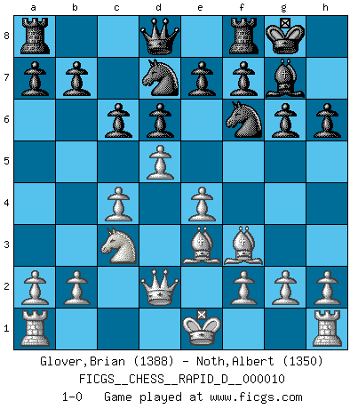 Last move : 1-0 2008 September 22 10:18:32 [Event "FICGS__CHESS__RAPID_D__000010"] [Site "FICGS"] [Date "2008.08.03"] [Round "1"] [White "Glover,Brian"] [Black "Noth,Albert"] [Result "1-0"] [WhiteElo "1388"] [BlackElo "1350"] 1.d4 d6 2.d5 Nf6 3.c4 g6 4.Bg5 Bg7 5.Nc3 O-O 6.e4 h6 7.Be3 c6 8.Nf3 Bg4 9.Be2 Bxf3 10.Bxf3 Nbd7 11.Qd2 1-0 This chess game has been lost on time (started : 2008.08.03 18:3:27) Queen's Pawn Kingside Castling by player Black (move 5) Player White won this chess game. Follow this game move after move (download)Many Chess players were surprised when after the game, Fischer quietly explained: 'I had already analyzed this possibility' in a position which I thought was not possible to foresee from the opening. (Mikhail Tal) Die größte Kunst beim Schach besteht darin dem Gegner nicht zu zeigen was er tun kann. (Garry Kasparov) Una clavada es mas poderosa que una espada. (Fred Reinfeld) Les pièces de l'échiquier étaient impitoyables. Elles le retenaient, elles l'absorbaient. Il y avait de l'horreur en cela, mais aussi une harmonie unique. Car, qu'y a-t-il dans le monde, à part les échecs ? (V. Nabokov) The weakness of an artist is dogma. (Josh Waitzkin)