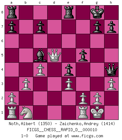 Last move : 1-0 2008 August 11 13:43:4 [Event "FICGS__CHESS__RAPID_D__000010"] [Site "FICGS"] [Date "2008.08.03"] [Round "1"] [White "Noth,Albert"] [Black "Zaichenko,Andrey"] [Result "1-0"] [WhiteElo "1350"] [BlackElo "1414"] 1.b3 e5 2.Bb2 Nc6 3.e3 d5 4.Bb5 Bd7 5.Bxc6 Bxc6 6.Nf3 e4 7.Ne5 Nf6 8.O-O Bd6 9.Nxc6 bxc6 10.Bxf6 Qxf6 11.c3 O-O 12.d3 Rfe8 13.d4 Qh4 14.h3 f5 15.c4 c5 16.dxc5 Bxc5 17.Qxd5+ 1-0 Nimzovich-Larsen attack : Modern variation Kingside Castling by player White (move 8) Kingside Castling by player Black (move 11) Player White won this chess game. Follow this game move after move (download)Avoid the crowd. Do your own thinking independently. Be the Chess player, not the Chess piece. (Ralph Charell) Ein guter Spieler hat immer Glück. (José Raúl Capablanca) El Ajedrez es la vida. (Bobby Fischer) Aux échecs, les retours au sommet sont rares : les dommages psychologiques consécutifs à une défaite sont trop sévères. (Daily Telegraph) They say in chess you've got to kill the queen, and then you mate it... Oh I, do you ? (Red Hot Chili Peppers, Fortune faded)