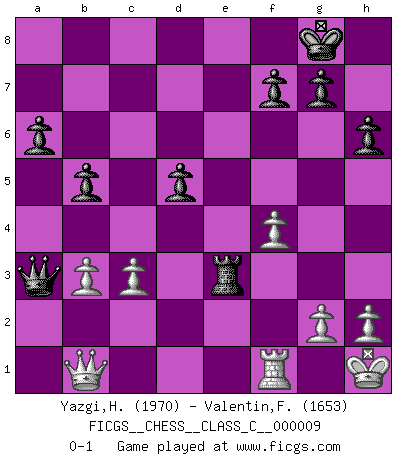 Last move : 0-1 2007 April 2 3:33:38 [Event "FICGS__CHESS__CLASS_C__000009"] [Site "FICGS"] [Date "2006.08.01"] [Round "1"] [White "Yazgi,Huseyin Yigit"] [Black "Valentin,Florea"] [Result "0-1"] [WhiteElo "1970"] [BlackElo "1653"] 1.d4 d5 2.Nf3 Nf6 3.e3 e6 4.Bd3 c5 5.c3 Nc6 6.Nbd2 Bd6 7.O-O O-O 8.dxc5 Bxc5 9.e4 Qc7 10.Qe2 h6 11.Bc2 b6 12.exd5 exd5 13.Nb3 Re8 14.Qd3 Be6 15.Nbd4 Bg4 16.Be3 Nxd4 17.Nxd4 Bh5 18.f4 b5 19.Rae1 a6 20.a3 Bd6 21.Nf5 Bg6 22.Qd2 Bxf5 23.Bxf5 Rxe3 24.Rxe3 Bc5 25.Kh1 Bxe3 26.Qxe3 Re8 27.Qd4 Re2 28.b3 Qc6 29.Kg1 Ne4 30.Bxe4 Rxe4 31.Qd3 Qc5+ 32.Kh1 Re3 33.Qb1 Qxa3 0-1 This chess game has been lost on time (started : 2006.08.01 15:15:51) Colle system Kingside Castling by player White (move 7) Kingside Castling by player Black (move 7) Player Black won this chess game. Follow this game move after move (download)Chess, like any creative activity, can exist only through the combined efforts of those who have creative talent, and those who have the ability to organize their creative work. (Mikhail Botvinnik) Wir irren allesamt, nur jeder irrt anders. (Georg Christoph Lichtenberg) Cada Peón es una Reina en potencia. (James Mason) Toutes les manuvres exécutées sur une colonne ouverte ont pour but ultime l'intrusion définitive sur la septième ou la huitième rangée, en plein cur de la position ennemie. (Aaron Nimzovitch) Rules and bones are meant to be broken. (Anonymous)