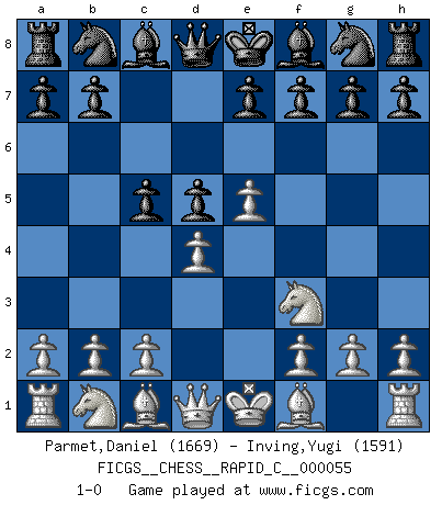 Last move : 1-0 2008 September 17 22:0:14 [Event "FICGS__CHESS__RAPID_C__000055"] [Site "FICGS"] [Date "2008.08.04"] [Round "1"] [White "Parmet,Daniel"] [Black "Inving,Yugi"] [Result "1-0"] [WhiteElo "1669"] [BlackElo "1591"] 1.e4 c6 2.d4 d5 3.e5 c5 4.Nf3 1-0 This chess game has been lost on time (started : 2008.08.04 9:56:57) Caro-Kann : Advance variation Player White won this chess game. Follow this game move after move (download)Pawn endings are to Chess what putting is to golf. (Cecil Purdy) Ich hatte Angst gegen einen russischen Großmeister zu verlieren, und er befürchtete gegen einen kleinen Jungen zu verlieren. (über ein Remis gegen Juri Awerbach). (Robert James Fischer) Solo existe una cosa que Fischer hace en el Ajedrez sin placer: ¡perder!. (Boris Spassky) C'est une question de caractère, Beaucoup de gens perdent leur motivation très vite. D'autres, ils sont rares, peuvent la conserver très longtemps. J'aime les échecs, encore aujourd'hui je suis heureux d'analyser des parties. J'aime toujours gagner, je déteste encore perdre. Bien jouer est important pour mon intégrité intellectuelle et morale. Et puis les échecs vivent en ce moment une période historique grâce à Internet. Ils se développent dans les systèmes éducatifs à travers le monde. Ils sortent de leur ghetto, et c'est mon rôle de mener à bien cette révolution. (Gary Kasparov) The next best thing to gambling and winning is gambling and loosing. (Nick Dandalos)