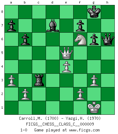 Last move : 1-0 2007 January 2 20:6:38 [Event "FICGS__CHESS__CLASS_C__000009"] [Site "FICGS"] [Date "2006.08.01"] [Round "1"] [White "Carroll,Mark"] [Black "Yazgi,Huseyin Yigit"] [Result "1-0"] [WhiteElo "1700"] [BlackElo "1970"] 1.e4 c5 2.d4 cxd4 3.c3 dxc3 4.Nxc3 Nc6 5.Nf3 e6 6.Bc4 Qc7 7.Qe2 Nf6 8.O-O Ng4 9.Nb5 Qb8 10.h3 h5 11.g3 Bc5 12.Bf4 Nge5 13.Nxe5 Nxe5 14.Rac1 d6 15.Bxe5 dxe5 16.Bxe6 Bxe6 17.Rxc5 O-O 18.Qxh5 g6 19.Qg5 b6 20.Rc3 Rc8 21.Rfc1 Rxc3 22.Rxc3 Qd8 23.Qxe5 Bxh3 24.Kh2 Bd7 25.Nc7 Rc8 26.a3 Qf8 27.Nd5 Qh6+ 28.Kg1 Rxc3 29.Nf6+ 1-0 Sicilian : Smith-Morra gambit Kingside Castling by player White (move 8) Kingside Castling by player Black (move 17) Player White won this chess game. Follow this game move after move (download)If Chess is a science, it's a most inexact one. If Chess is an art, it is too exacting to be seen as one. If Chess is a sport, it's too esoteric. If Chess is a game, it's too demanding to be just a game. If Chess is a mistress, she's a demanding one. If Chess is a passion, it's a rewarding one. If Chess is life, it's a sad one. (Unknown) Später, ... hatte ich zunehmend Erfolg in entscheidenden Partien. Vielleicht weil ich eine einfache Wahrheit erkannte: nicht nur ich hatte Angst, auch mein Gegner. (Mikhail Nekhemyevich Tal) El Ajedrez es tortura mental. (Garry Kasparov) Il n'y a pas de prix trop élevé au scalp de l'ennemi. (Koblentz) When I took office, only high energy physicists had ever heard of what is called the World Wide Web... Now even my cat has its own page. (Bill Clinton, 1996)