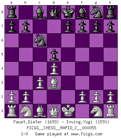 Last move : 1-0 2008 September 9 9:0:8 [Event "FICGS__CHESS__RAPID_C__000055"] [Site "FICGS"] [Date "2008.08.04"] [Round "1"] [White "Faust,Dieter"] [Black "Inving,Yugi"] [Result "1-0"] [WhiteElo "1693"] [BlackElo "1591"] 1.e4 c6 2.d4 d5 3.exd5 cxd5 4.Bd3 Nc6 5.c3 1-0 This chess game has been lost on time (started : 2008.08.04 9:56:57) Caro-Kann : Exchange variation Player White won this chess game. Follow this game move after move (download)What is the object of playing a gambit opening?... To acquire a reputation of being a dashing player at the cost of losing a game. (Siegbert Tarrasch) Im Spitzenschach von heute geht es nur um Vorbereitung, um tiefgründige, sorgfältige Eröffnungsvorbereitung. (Nigel Short) No hay precio que no valga la pena por la cabellera del Rey enemigo. (Koblentz) Les pièces de l'échiquier étaient impitoyables. Elles le retenaient, elles l'absorbaient. Il y avait de l'horreur en cela, mais aussi une harmonie unique. Car, qu'y a-t-il dans le monde, à part les échecs ? (V. Nabokov) The good fighters of old first put themselves beyond the possibility of defeat, and then waited for an opportunity of defeating the enemy. (Sun Tzu)