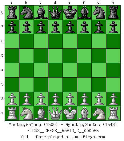 Last move : 0-1 2008 September 3 20:41:15 [Event "FICGS__CHESS__RAPID_C__000055"] [Site "FICGS"] [Date "2008.08.04"] [Round "1"] [White "Morton,Antony"] [Black "Agustin,Santos"] [Result "0-1"] [WhiteElo "1500"] [BlackElo "1643"] 0-1 This chess game has been lost on time (started : 2008.08.04 9:56:57) Player Black won this chess game. Follow this game move after move (download)The most powerful weapon in Chess is to have the next move. (David Bronstein) Das Zentrum ist der Balkan des Schachbretts - Kriegshandlungen können in jedem Moment ausbrechen. (Aaron Nimzowitsch) Las combinaciones han sido siempre el aspecto más intrigante del Ajedrez. Los Maestros las buscan, el público las aplauden, los críticos las alaban. La razón se debe a que las combinaciones hacen posible que el Ajedrez sea más que un ejercicio matemático con una carencia de vida. Ellas son la poesía del juego, son del Ajedrez lo que la melodía es de la música. Ellas representan el triunfo de la mente sobre la materia. (Reuben Fine) Vous m'avez demandé de vous exposer quel est le fondement de la prière. Je ne fais que préparer les pièces du jeu sur la table... Nous sera-t-il permis d'en adopter les règles et si nous les appliquons scrupuleusement nous ne tarderons pas à faire mat le Roi divin ! Il ne pourra échapper à nos mains. (Sainte Thérèse d'Avila, Chemin de perfection) I fear not the man who has practiced 10,000 kicks once, but I fear the man who has practiced one kick 10,000 times. (Bruce Lee)