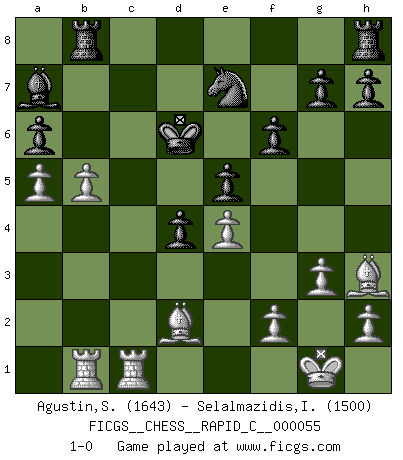 Last move : 1-0 2008 October 10 19:56:21 [Event "FICGS__CHESS__RAPID_C__000055"] [Site "FICGS"] [Date "2008.08.04"] [Round "1"] [White "Agustin,Santos"] [Black "Selalmazidis,Igor"] [Result "1-0"] [WhiteElo "1643"] [BlackElo "1500"] 1.d4 Nf6 2.Nf3 d5 3.c4 e6 4.g3 dxc4 5.Bg2 c5 6.O-O Nc6 7.Ne5 Bd7 8.Na3 cxd4 9.Naxc4 Rc8 10.Qb3 Nd5 11.Qxb7 Nxe5 12.Nxe5 f6 13.Nxd7 Qxd7 14.Qxd7+ Kxd7 15.Rd1 Bc5 16.Rb1 Kd6 17.Bd2 e5 18.e4 Nb4 19.a3 Nc6 20.Bh3 Rb8 21.b4 Bb6 22.Rdc1 Ne7 23.a4 a6 24.a5 Ba7 25.b5 1-0 Queen's pawn game Kingside Castling by player White (move 6) Player White won this chess game. Follow this game move after move (download)Chess is a terrific way for kids to build self image and self esteem. (Saudin Robovic) Wer mein Gambit spielt, muß bereit sein, alle Brücken hinter sich abzubrechen. Es verändert den ganzen Menschen. Es wirkt wie ein Zauberstab und fördert verkümmerte, gute Charakter- eigenschaften wieder zu Tage. (Emil Joseph Diemer) La batalla por la última verdad nunca sera ganada. Y es por eso que el Ajedrez es tan fascinante. (Hans Kmoch) Les échecs c'est le défi de l'alpiniste, toujours plus haut, prêt à tout pour monter à l'assaut du Roi ennemi. Les échecs, c'est de la musique en mouvement, un ballet majestueux pour les yeux. C'est de la poésie composée par les fantômes du passé qui au même titre que Rimbaud ou Verlaine méritent notre admiration. Les échecs, c'est de la peinture ou le moindre mouvement modifie le tableau pour en faire un Picasso ou un Van Gogh. Les échecs, c'est tout et rien, c'est la vie et la mort. Jjulie33 sur le forum de France-Echecs. Memory is a complicated thing, a relative to truth, but not its twin. (Barbara Kingsolver, Animal Dreams)