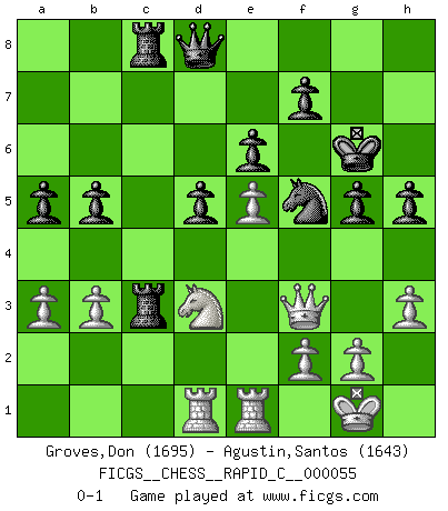 Last move : 0-1 2008 September 2 23:19:44 [Event "FICGS__CHESS__RAPID_C__000055"] [Site "FICGS"] [Date "2008.08.04"] [Round "1"] [White "Groves,Don"] [Black "Agustin,Santos"] [Result "0-1"] [WhiteElo "1695"] [BlackElo "1643"] 1.e4 e6 2.d4 d5 3.Nc3 Bb4 4.e5 c5 5.Bd2 Ne7 6.dxc5 Nbc6 7.Qg4 Ng6 8.Nf3 Bxc5 9.Bd3 O-O 10.Qh5 Nb4 11.O-O Nxd3 12.cxd3 Bd7 13.d4 Be7 14.Bg5 Bxg5 15.Nxg5 h6 16.Nf3 Qb6 17.Rfb1 Rac8 18.Qg4 Bb5 19.Rd1 Bd3 20.Rd2 Bf5 21.Qg3 Rc4 22.Re1 Rfc8 23.h3 Qa5 24.Rde2 Qa6 25.a3 b5 26.Na2 Ne7 27.Qf4 g5 28.Qe3 Be4 29.Rd2 Nf5 30.Qe2 Bxf3 31.Qxf3 Rxd4 32.Nb4 Qb6 33.Nd3 Rdc4 34.Nb4 Rf4 35.Qd1 a5 36.Nd3 Rfc4 37.Kh2 Kg7 38.Qf3 Qd8 39.R2d1 Kg6 40.Kg1 h5 41.b3 Rc3 0-1 French : Winawer, Advance, Bogolyubov variation Kingside Castling by player Black (move 9) Kingside Castling by player White (move 11) Player Black won this chess game. Follow this game move after move (download)Castle early and often. (Rob Sillars) Der Schachmeister von Heute braucht Courage, einen Killerinstinkt, Ausdauer und Arroganz. (Larry Evans) Ciertamente, de todas la drogas del mundo, el Ajedrez debe ser el mas placentero permamentemente. (Assiac) Un journaliste : 'Vous préférez avoir une dame de plus sur l'échiquier ou au lit ?' Boris Spassky : 'Ca dépend de la position.' The modern world has divided itself into Conservatives and Progressives. The business of Progressives is to go on making mistakes. The business of the Conservatives is to prevent the mistakes from being corrected. (G.K. Chesterton)