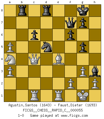 Last move : 1-0 2008 September 3 10:53:56 [Event "FICGS__CHESS__RAPID_C__000055"] [Site "FICGS"] [Date "2008.08.04"] [Round "1"] [White "Agustin,Santos"] [Black "Faust,Dieter"] [Result "1-0"] [WhiteElo "1643"] [BlackElo "1693"] 1.c4 c6 2.e4 d5 3.cxd5 cxd5 4.exd5 Qxd5 5.d4 Nc6 6.Nf3 e6 7.Be2 Nf6 8.O-O Be7 9.Nc3 Qd8 10.Be3 O-O 11.Ne5 Bd6 12.Nxc6 bxc6 13.Qc2 Rb8 14.Rfe1 Qc7 15.g3 Rd8 16.Rac1 Qa5 17.a3 e5 18.dxe5 Bxe5 19.Na4 Nd5 20.Bg5 f6 21.Bd3 h6 22.Rxe5 hxg5 23.R5e1 Qc7 24.Be4 Bh3 25.b4 a5 26.Qc4 Qf7 27.bxa5 1-0 English : Caro-Kann defensive system Kingside Castling by player White (move 8) Kingside Castling by player Black (move 10) Player White won this chess game. Follow this game move after move (download)Fischer wanted to give the Russians a taste of their own medicine. (Larry Evans) Ich kenne Menschen, die allen Willen der Welt besitzen und doch nicht Schach spielen können. (Robert James Fischer) Robert Fischer es la ley hacia si mismo. (Larry Evans) Karpov est une pièce de musée. (Garry Kasparov) If you ain't just a little scared when you enter a casino, you are either very rich or you haven't studied the games enough. (Pappy)