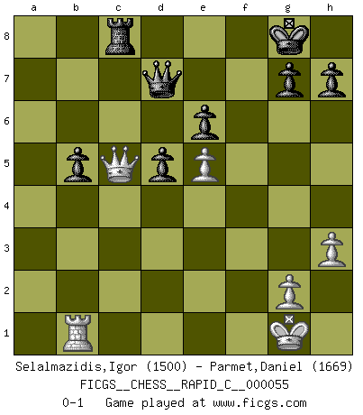 Last move : 0-1 2008 December 6 22:55:54 [Event "FICGS__CHESS__RAPID_C__000055"] [Site "FICGS"] [Date "2008.08.04"] [Round "1"] [White "Selalmazidis,Igor"] [Black "Parmet,Daniel"] [Result "0-1"] [WhiteElo "1500"] [BlackElo "1669"] 1.e4 e5 2.Nf3 Nc6 3.Bb5 a6 4.Ba4 Nf6 5.O-O Nxe4 6.d4 b5 7.Bb3 d5 8.dxe5 Be6 9.Nbd2 Nc5 10.c3 Nxb3 11.Nxb3 Be7 12.Nfd4 Qd7 13.Nxc6 Qxc6 14.Nd4 Qd7 15.b4 O-O 16.h3 a5 17.a3 axb4 18.cxb4 Bxb4 19.Bb2 Be7 20.f4 c5 21.f5 cxd4 22.fxe6 fxe6 23.Qxd4 Rxf1+ 24.Rxf1 Bxa3 25.Bxa3 Rxa3 26.Qc5 Ra8 27.Rb1 Rc8 0-1 This chess game has been lost on time (started : 2008.08.04 9:56:57) Ruy Lopez : Open, 7.Bb3 Kingside Castling by player White (move 5) Kingside Castling by player Black (move 15) Player Black won this chess game. Follow this game move after move (download)In Chess, at least, the brave inherit the earth. (Edmar Mednis) Ein bischen Romantik kann weder im Schach noch in der Liebe schaden. Also versuche ich mich ab und zu daran zu erinnern. (Nigel Short) No es una movida, aún la mejor movida que tu debas buscar, sino un plan comprensible. (Eugene Znosko-Borovsky) Donnez-moi un Cavalier en 6e et je gagnerais toutes mes parties. (Steinitz) The faster the computer, the slower the brain. (Thibault de Vassal)