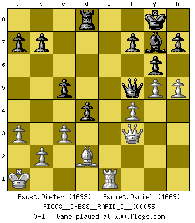 Last move : 0-1 2008 October 9 10:20:38 [Event "FICGS__CHESS__RAPID_C__000055"] [Site "FICGS"] [Date "2008.08.04"] [Round "1"] [White "Faust,Dieter"] [Black "Parmet,Daniel"] [Result "0-1"] [WhiteElo "1693"] [BlackElo "1669"] 1.e4 e5 2.d4 exd4 3.Qxd4 Nc6 4.Qe3 Nf6 5.Nc3 Bb4 6.Bd2 O-O 7.O-O-O Re8 8.Qg3 Nxe4 9.Nxe4 Rxe4 10.c3 Bd6 11.Qd3 Re8 12.Nf3 Ne5 13.Qf5 Nxf3 14.Bd3 Qh4 15.Qxf3 Be5 16.Rde1 d6 17.Qg3 Qa4 18.f4 Bf6 19.Bc2 Rxe1+ 20.Rxe1 Qc6 21.Be4 Qc5 22.Qd3 g6 23.a3 Bf5 24.Bxf5 Qxf5 25.Qf3 d5 26.g4 Qd7 27.g5 Bg7 28.h4 Rd8 29.h5 c5 30.Kb1 Qf5+ 31.Ka1 d4 0-1 Centre game : Berger variation Kingside Castling by player Black (move 6) Queenside Castling by player White (move 7) Player Black won this chess game. Follow this game move after move (download)Chess is not like life... it has rules ! (Mark Pasternak) Man wirke der falschen Auffassung entgegen, als ob jeder Zug Unmittelbares zu leisten habe; auch Werte- und Ruhezüge haben ihre Existenzberechtigung. (Aaron Nimzowitsch) La vida es como un juego de Ajedrez, cambiando con cada movimiento. (Proverbio Chino) Un footballeur joue avec ses pieds, parfois avec sa tête. Un joueur d'échecs ne joue qu'avec sa tête. Et quand il ne joue plus, il meurt. (Jacob Murray) I don't know, I don't care, and it doesn't make any difference. (Albert Einstein)