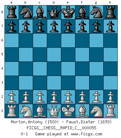 Last move : 0-1 2008 September 3 20:41:15 [Event "FICGS__CHESS__RAPID_C__000055"] [Site "FICGS"] [Date "2008.08.04"] [Round "1"] [White "Morton,Antony"] [Black "Faust,Dieter"] [Result "0-1"] [WhiteElo "1500"] [BlackElo "1693"] 0-1 This chess game has been lost on time (started : 2008.08.04 9:56:57) Player Black won this chess game. Follow this game move after move (download)Not all artists are Chess players, but all Chess players are artists. (Marcel Duchamp) Ich glaube nicht an Psychologie, ich glaube an gute Züge. (Robert James Fischer) El Ajedrez detiene a su maestro dentro de sus propios vínculos, encadenando la mente y el cerebro, por lo que la libertad interior del mas fuerte debe sufrir. (Albert Einstein) J'ai vu le vaincu d'Echecs jouer des années durant dans l'espoir de la fête de la victoire. Car tu es plus riche de ce qu'elle existe si même elle n'est point pour toi. Ainsi de la perle du fond des mers. (Antoine de Saint-Exupéry) A computer lets you make more mistakes faster than any invention in human history - with the possible exceptions of handguns and tequila. (Mitch Ratcliffe)