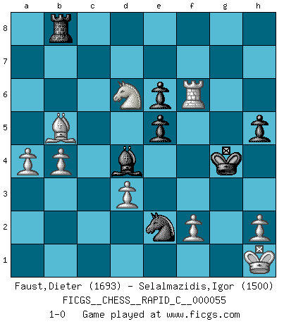 Last move : 1-0 2008 December 11 2:9:52 [Event "FICGS__CHESS__RAPID_C__000055"] [Site "FICGS"] [Date "2008.08.04"] [Round "1"] [White "Faust,Dieter"] [Black "Selalmazidis,Igor"] [Result "1-0"] [WhiteElo "1693"] [BlackElo "1500"] 1.e4 e5 2.Nf3 Nc6 3.Bc4 Nf6 4.Ng5 d5 5.exd5 Na5 6.Bb5+ c6 7.dxc6 bxc6 8.Be2 h6 9.Nh3 Bd6 10.d3 O-O 11.Nc3 Rb8 12.O-O Bc7 13.Kh1 Bxh3 14.gxh3 Qd7 15.Rg1 Qxh3 16.Rg3 Qh4 17.Qf1 Nd5 18.Rg4 Qf6 19.Ne4 Qe6 20.Qg2 Kh8 21.Nc5 Qd6 22.Rxg7 Rg8 23.Rxg8+ Rxg8 24.Qh3 Rg6 25.Bh5 Rg7 26.Ne4 Qe6 27.Qxe6 fxe6 28.Bd2 Nf4 29.Be8 Re7 30.Bxa5 Bxa5 31.Bxc6 Rf7 32.Rf1 Bb6 33.Be8 Rf8 34.Bd7 Kg8 35.Rg1+ Kf7 36.Rg3 Rb8 37.a3 Ne2 38.Rg4 Bd4 39.c3 Bb6 40.a4 a6 41.b4 a5 42.Bb5 axb4 43.cxb4 Bd4 44.Nd6+ Kf6 45.Rh4 Kg5 46.Rh3 h5 47.Rf3 Kg4 48.Rf6 1-0 This chess game has been lost on time (started : 2008.08.04 9:56:57) Two knights defense Kingside Castling by player Black (move 10) Kingside Castling by player White (move 12) Player White won this chess game. Follow this game move after move (download)Combinations have always been the most intriguing aspect of Chess. The masters look for them, the public applauds them, the critics praise them. It is because combinations are possible that Chess is more than a lifeless mathematical exercise. They are the poetry of the game; they are to Chess what melody is to music. They represent the triumph of mind over matter. (Reuben Fine) Dein Körper muss in Topform sein. Dein Schach verfällt, wenn dein Körper verfällt. Der Körper kann nicht vom Geist getrennt werden. (Robert James Fischer) La belleza de un movimiento no se refleja solo en su apariencia, sino en el pensamiento detrás de él. (Siegbert Tarrasch) Soyez une menace à chaque fois que vous vous asseyez pour jouer. (Ken Smith) As the days dwindle down... to a precious few. (Maxwell Anderson)