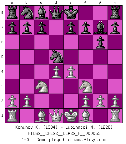 Last move : 1-0 2008 September 29 10:32:55 [Event "FICGS__CHESS__CLASS_F__000063"] [Site "FICGS"] [Date "2008.08.04"] [Round "1"] [White "Konuhov,Konstantin"] [Black "Lupinacci,Nicola"] [Result "1-0"] [WhiteElo "1384"] [BlackElo "1228"] 1.d4 Nf6 2.Nf3 g6 3.c4 Bg7 4.Nc3 d5 5.cxd5 Nxd5 6.e4 1-0 This chess game has been lost on time (started : 2008.08.04 12:51:45) King's Indian : East Indian defense Player White won this chess game. Follow this game move after move (download)Help your pieces so they can help you. (Paul Morphy) Ich tröste mich mit dem Vergnügen, daß Schachfans, Zuschauer und Leser glücklich sind, wenn ein Großmeister etwas riskiert, statt nur Klötzchen zu schieben. (Mikhail Nekhemyevich Tal) El Ajedrez, como cualquier otra actividad creativa, puede existir solo a través de méritos combinados de aquellos que tienen talento creativo y de aquellos que tienen la habilidad de organizar un trabajo creativo. (Mikhail Botvinnik) Horreur, mais aussi harmonie suprême : qu'y avait-il en effet au monde en dehors des échecs ? Le brouillard, l'inconnu, le non-être... (Vladimir Nabokov) War is the child of passion, passion is the child of narcissism and narcissism is the child. (...) Another game ? (Thibault de Vassal)