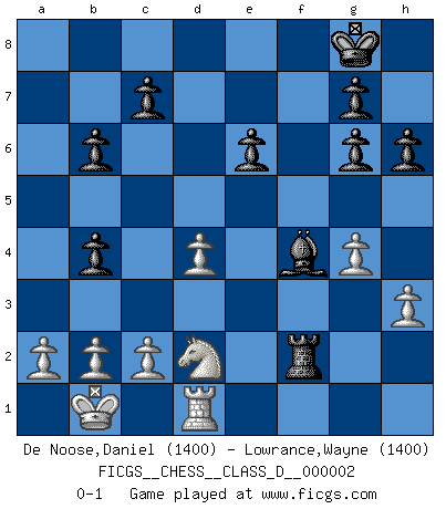 Last move : 0-1 2006 September 8 23:59:54 [Event "FICGS__CHESS__CLASS_D__000002"] [Site "FICGS"] [Date "2006.04.15"] [Round "1"] [White "De Noose,Daniel"] [Black "Lowrance,Wayne"] [Result "0-1"] [WhiteElo "1400"] [BlackElo "1400"] 1.e4 e6 2.d4 d5 3.Nc3 Nf6 4.Bg5 dxe4 5.Nxe4 Nbd7 6.Nf3 h6 7.Nxf6+ Nxf6 8.Be3 Bd6 9.Bd3 O-O 10.Qe2 b6 11.O-O-O Bb7 12.Ne5 Nd5 13.Bd2 Qh4 14.g4 Nb4 15.Be4 Bxe4 16.Qxe4 a5 17.Nf3 Qf6 18.Kb1 Qg6 19.Qxg6 fxg6 20.Bxb4 axb4 21.Rd3 Rf4 22.Rg1 Raf8 23.Nd2 Rxf2 24.h3 Re2 25.Nc4 Bh2 26.Rgd1 R8f2 27.R3d2 Rxd2 28.Nxd2 Bf4 0-1 French : Burn variation Kingside Castling by player Black (move 9) Queenside Castling by player White (move 11) Player Black won this chess game. Follow this game move after move (download)Fischer prefers to enter Chess history alone. (Miguel Najdorf) Wenn es im Universum noch irgendwo intelligente Lebewesen gibt, dann kennen sie Go. (Emanuel Lasker) Bobby Fischer es el mas grande genio de Ajedrez de todos los tiempos. (Alexander Kotov) Avant la finale, les dieux ont créé le milieu de partie. (Tarrasch) Luck has a peculiar habit of favoring those who don't depend on it. (Author unknown)