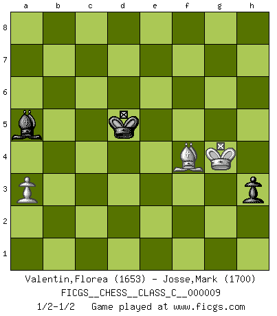 Last move : 1/2-1/2 2006 October 27 18:55:28 [Event "FICGS__CHESS__CLASS_C__000009"] [Site "FICGS"] [Date "2006.08.01"] [Round "1"] [White "Valentin,Florea"] [Black "Josse,Mark"] [Result "1/2-1/2"] [WhiteElo "1653"] [BlackElo "1700"] 1.e4 c5 2.Nf3 d6 3.d4 cxd4 4.Nxd4 Nf6 5.Nc3 g6 6.Be3 Bg7 7.f3 Nc6 8.Qd2 O-O 9.O-O-O d5 10.exd5 Nxd5 11.Nxc6 bxc6 12.Nxd5 cxd5 13.Qxd5 Qc7 14.Qc5 Qb7 15.Qa3 Bf5 16.Bd3 Rab8 17.b3 Qc6 18.Bxf5 Qc3 19.Bd3 Rbc8 20.Qa4 Rfd8 21.b4 Rxd3 22.Rxd3 Qa1+ 23.Kd2 Qxh1 24.Qxa7 Qxg2+ 25.Bf2 Qxh2 26.Kd1 h5 27.Qe3 h4 28.f4 Rc4 29.f5 Rxb4 30.fxg6 fxg6 31.Qxe7 Qf4 32.Qe3 Qf5 33.a3 Rc4 34.Be1 Kh7 35.Bd2 Qf1+ 36.Qe1 Qxe1+ 37.Kxe1 Bf6 38.Rd6 Kg7 39.Rd7+ Kg8 40.c3 h3 41.Kf2 Rg4 42.Be3 Rg2+ 43.Kf3 g5 44.Ke4 Bxc3 45.Rd1 Ba5 46.Rh1 g4 47.Bf4 Kf7 48.Kf5 Ke7 49.Rb1 Kd7 50.Rb7+ Kc6 51.Rg7 Kd5 52.Rxg4 Rxg4 53.Kxg4 1/2-1/2 Sicilian : Dragon, Yugoslav attack Kingside Castling by player Black (move 8) Queenside Castling by player White (move 9) 10 pieces endgame at move 37 : White KRBPP , Black KRBPP WHITE : King + 1 Rook 1 Bishop 2 Pawns BLACK : King + 1 Rook 1 Bishop 2 Pawns 9 pieces endgame at move 44 : White KRBP , Black KRBPP WHITE : King + 1 Rook 1 Bishop 1 Pawn BLACK : King + 1 Rook 1 Bishop 2 Pawns 8 pieces endgame at move 52 : White KRBP , Black KRBP WHITE : King + 1 Rook 1 Bishop 1 Pawn BLACK : King + 1 Rook 1 Bishop 1 Pawn 7 pieces endgame at move 52 : White KBP , Black KRBP WHITE : King + 1 Bishop 1 Pawn BLACK : King + 1 Rook 1 Bishop 1 Pawn 6 pieces endgame at move 53 : White KBP , Black KBP WHITE : King + 1 Bishop 1 Pawn BLACK : King + 1 Bishop 1 Pawn This chess game ended in a draw. Follow this game move after move (download)Chess opens and enriches your mind. (Saudin Robovic) Über Frauen: Chess is better. (Robert James Fischer) Ciertamente, de todas la drogas del mundo, el Ajedrez debe ser el mas placentero permamentemente. (Assiac) Il (Jacob Murray) ne joue pas pour le bon coup, mais pour le meilleur. (Eloi Relange) What doesn't kill us makes us stronger. (Friedrich Nietzsche)