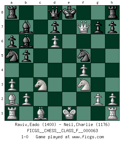 Last move : 1-0 2008 September 10 10:51:17 [Event "FICGS__CHESS__CLASS_F__000063"] [Site "FICGS"] [Date "2008.08.04"] [Round "1"] [White "Raviv,Eado"] [Black "Neil,Charlie"] [Result "1-0"] [WhiteElo "1400"] [BlackElo "1176"] 1.e4 c5 2.Nc3 Nc6 3.f4 e6 4.Bc4 a6 5.a3 b5 6.Ba2 c4 7.Nf3 Bc5 8.d4 cxd3 9.cxd3 Nge7 10.d4 Bb6 11.d5 exd5 12.exd5 Na5 13.d6 Nf5 14.Qd5 Bb7 15.Qxf7+ 1-0 Sicilian : Grand Prix attack Player White won this chess game. Follow this game move after move (download)Winning isn't everything... but losing is nothing. (Mednis) Obendrein hat der FIDE-Präsident den Revolutionsführer Gaddafi zum »Großmeister« ernannt, am Ende der WM. Das ist lächerlich! (Joel Lautier) Dios mío, Bobby Fischer juega tan simple. (Alexei Suetin) Je ne crois pas en la psychologie, je crois aux bons coups. (Robert Fischer) Control your own destiny or someone else will. (Jack Welch)