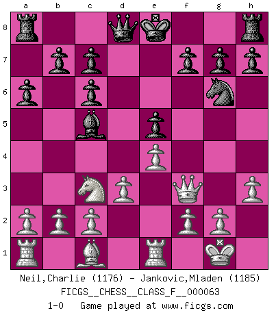 Last move : 1-0 2008 October 7 22:56:57 [Event "FICGS__CHESS__CLASS_F__000063"] [Site "FICGS"] [Date "2008.08.04"] [Round "1"] [White "Neil,Charlie"] [Black "Jankovic,Mladen"] [Result "1-0"] [WhiteElo "1176"] [BlackElo "1185"] 1.e4 e5 2.Nf3 Nc6 3.Bb5 a6 4.Bxc6 dxc6 5.O-O Bg4 6.h3 Bxf3 7.Qxf3 Ne7 8.d3 Ng6 9.Nc3 Bc5 10.Re1 1-0 This chess game has been lost on time (started : 2008.08.04 12:51:45) Ruy Lopez : Exchange variation, 5.O-O Kingside Castling by player White (move 5) Player White won this chess game. Follow this game move after move (download)We must make sure that Chess will not be like a dead language, very interesting, but for a very small group. (Sytze Faber) Ein Schachgenie ist jemand der verdammt gut Schach spielt. (Jonathan Levitt) Hoy en día, si tu no eres un Gran Maestro a los 14 años, es mejor que lo olvides. (Anand Viswanathan) Horreur, mais aussi harmonie suprême : qu'y avait-il en effet au monde en dehors des échecs ? Le brouillard, l'inconnu, le non-être... (Vladimir Nabokov) You can't play chess if you're groggy from pills. (Anatoly Karpov)
