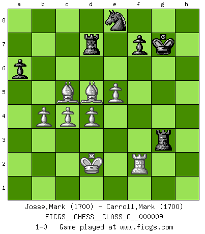 Last move : 1-0 2006 December 13 20:26:39 [Event "FICGS__CHESS__CLASS_C__000009"] [Site "FICGS"] [Date "2006.08.01"] [Round "1"] [White "Josse,Mark"] [Black "Carroll,Mark"] [Result "1-0"] [WhiteElo "1700"] [BlackElo "1700"] 1.e4 c5 2.Nc3 Nc6 3.Nf3 e5 4.Bc4 Be7 5.d3 d6 6.Nd2 Nf6 7.Nf1 O-O 8.Ne3 Be6 9.O-O a6 10.a4 Qd7 11.Ncd5 Rab8 12.a5 Bd8 13.f4 exf4 14.Rxf4 Ne5 15.Bb3 Qc8 16.Nxf6+ Bxf6 17.Rxf6 gxf6 18.Nd5 Bxd5 19.Bxd5 Qg4 20.Qxg4+ Nxg4 21.h3 Ne5 22.Bh6 Rfe8 23.Rf1 b6 24.axb6 Rxb6 25.b3 Nd7 26.Rf4 Nf8 27.Rxf6 Re7 28.Kf2 Ne6 29.Ke3 Nc7 30.Bc4 Rd7 31.Bg5 Ne8 32.Rf5 Ng7 33.Rf1 Ne6 34.Bf6 Nc7 35.Rf5 Kf8 36.g4 Ne6 37.h4 Ng7 38.Rf2 Ne8 39.Bb2 Re7 40.g5 h6 41.gxh6 d5 42.Bxd5 Rxh6 43.Ba3 Rc7 44.d4 Rxh4 45.Bxc5+ Kg7 46.e5 Rh3+ 47.Kd2 Rg3 48.b4 Rd7 49.c4 1-0 Sicilian : Closed, 2...Nc6 Kingside Castling by player Black (move 7) Kingside Castling by player White (move 9) Player White won this chess game. Follow this game move after move (download)The battle for the ultimate truth will never be won. And that's why Chess is so fascinating. (Hans Kmoch) Die starken Figuren des Gegners muss man abtauschen. (José Raúl Capablanca) ¿Esta Bobby Fischer algo cuerdo?. (Salo Flohr) Botvinnik disait en comparant les échecs à la musique: Il existe une science dont le but est l'étude de l'acoustique et des sons. Mais il y a aussi un art qui se sert de l'océan des sons : c'est la musique. De toute évidence, il en est de même pour la pensée. La logique est l'étude des lois de la réflexion et les échecs reflètent, en tant qu'art, le côté logique de la réflexion, sous la forme d'images artistiques... Extrait de Fischer - Spassky, Reykjavik 1972 par Alexander & F. Wyndham (Ed. Solar), p 37. A good aphorism is too hard for the tooth of time, and is not worn away with the centuries, although it serves as food for every speech. (Friedrich Nietzsche)