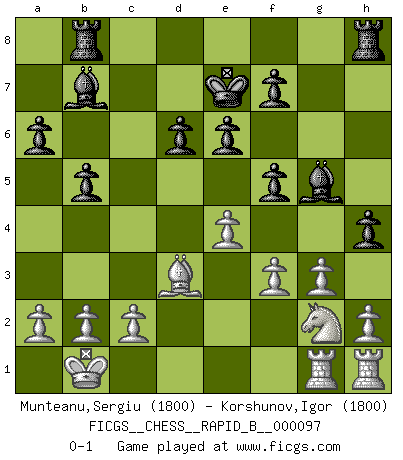 Last move : 0-1 2008 October 13 23:22:30 [Event "FICGS__CHESS__RAPID_B__000097"] [Site "FICGS"] [Date "2008.08.04"] [Round "1"] [White "Munteanu,Sergiu"] [Black "Korshunov,Igor"] [Result "0-1"] [WhiteElo "1800"] [BlackElo "1800"] 1.e4 c5 2.Nf3 d6 3.d4 cxd4 4.Nxd4 Nf6 5.Nc3 a6 6.Bg5 e6 7.Nf3 h6 8.Bh4 Nc6 9.Qd2 Be7 10.O-O-O b5 11.Bxf6 gxf6 12.Nd4 Nxd4 13.Qxd4 Rb8 14.f3 Qb6 15.Qxb6 Rxb6 16.Bd3 Rb8 17.g3 h5 18.Ne2 h4 19.Nf4 Bb7 20.Ng2 f5 21.Rdg1 Bg5+ 22.Kb1 Ke7 0-1 This chess game has been lost on time (started : 2008.08.04 21:29:53) Sicilian : Najdorf, 6...e6 Queenside Castling by player White (move 10) Player Black won this chess game. Follow this game move after move (download)The blunders are all there on the board, waiting to be made. (Savielly Tartakover) Kombinieren und Schwarzhandel gehören verboten. (Savielly Grigorievitsch Tartakower) Una victoria por una combinación errónea, aunque sea espectacular, me llena de horror artístico. (Wilhelm Steinitz) Dieu déplace le joueur, et celui-ci la pièce. Quel Dieu derrière Dieu commence donc la trame ? Arturo Perez-Reverte (prix de littérature policière 1993). Ah, beer! The cause of, and the solution to, all of life's problems. (Homer Simpson)