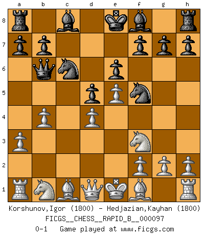 Last move : 0-1 2008 October 19 0:17:26 [Event "FICGS__CHESS__RAPID_B__000097"] [Site "FICGS"] [Date "2008.08.04"] [Round "1"] [White "Korshunov,Igor"] [Black "Hedjazian,Kayhan"] [Result "0-1"] [WhiteElo "1800"] [BlackElo "1800"] 1.e4 e6 2.d4 d5 3.e5 c5 4.c3 Nc6 5.Nf3 Qb6 6.a3 Nh6 7.b4 cxd4 8.cxd4 Nf5 0-1 This chess game has been lost on time (started : 2008.08.04 21:29:53) French : Advance, Paulsen attack Player Black won this chess game. Follow this game move after move (download)The passion for playing Chess is one of the most unaccountable in the world. (H.G. Wells) Ja, jede Frau in Holland liebt mich bestimmt, und alle Männer hassen mich. (Loek van Wely) El Ajedrez es el gimnasio de la mente. (Blaise Pascal) Le thème de l'attaque double intervient d'une manière ou d'une autre dans l'immense majorité des combinaisons. (Youri Averbakh) An expert is a man who has made all the mistakes which can be made in a very narrow field. (Niels Bohr)
