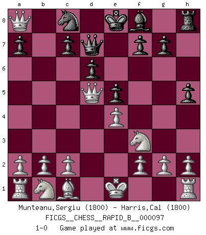 Last move : 1-0 2008 August 10 19:18:18 [Event "FICGS__CHESS__RAPID_B__000097"] [Site "FICGS"] [Date "2008.08.04"] [Round "1"] [White "Munteanu,Sergiu"] [Black "Harris,Cal"] [Result "1-0"] [WhiteElo "1800"] [BlackElo "1800"] 1.e4 e5 2.Nf3 Nc6 3.Bb5 d6 4.d4 Bg4 5.d5 Nge7 6.dxc6 h5 7.cxb7 Bd7 8.Bxd7+ Qxd7 9.bxa8Q+ Nc8 10.Q1d5 1-0 Ruy Lopez : Old Steinitz defense Promotion Queen by player White (move 9) Player White won this chess game. Follow this game move after move (download)Chess opens and enriches your mind. (Saudin Robovic) Wenn es im Universum noch irgendwo intelligente Lebewesen gibt, dann kennen sie Go. (Emanuel Lasker) Personalmente, yo prefiero mirar hacia el futuro en donde un programa de computadora gane el título mundial de Ajedrez. La humanidad necesita una lección de humildad. (Richard Dawkings) Il n'y a plus de joueurs du niveau de Jacob Murray dont la seule quête est le beau jeu, le plaisir de voir les pièces construire quelque chose. Sur 10 idées à la minute, 9 seront sans intérêt, la dernière s'avèrera géniale. (Christian Bauer) Men never do evil so completely and cheerfully as when they do it from religious conviction. (Blaise Pascal)