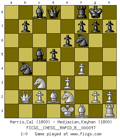 Last move : 1-0 2008 October 18 0:11:6 [Event "FICGS__CHESS__RAPID_B__000097"] [Site "FICGS"] [Date "2008.08.04"] [Round "1"] [White "Harris,Cal"] [Black "Hedjazian,Kayhan"] [Result "1-0"] [WhiteElo "1800"] [BlackElo "1800"] 1.d4 Nf6 2.e3 c5 3.dxc5 Nc6 4.f4 e6 5.Nc3 Bxc5 6.Nge2 d5 7.a3 a5 8.Bd2 O-O 9.b4 axb4 10.axb4 Rxa1 11.Qxa1 Nxb4 12.Qb2 1-0 This chess game has been lost on time (started : 2008.08.04 21:29:53) Queen's pawn game Kingside Castling by player Black (move 8) Player White won this chess game. Follow this game move after move (download)The battle for the ultimate truth will never be won. And that's why Chess is so fascinating. (Hans Kmoch) Bobby Fischer ist kein Vorbild für die heutige Jugend. (Viktor Kortschnoi) El Ajedrez lo es todo: arte, ciencia y deporte. (Anatoly Karpov) Si rien de grave n'est détecté lors de l'analyse d'une position, on joue alors le coup. Seconde règle de Blumenfeld. Unless I accept my faults I will most certainly doubt my virtues. (Hugh Prather)