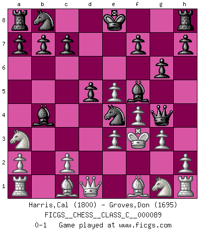 Last move : 0-1 2008 August 10 4:59:36 [Event "FICGS__CHESS__CLASS_C__000089"] [Site "FICGS"] [Date "2008.08.07"] [Round "1"] [White "Harris,Cal"] [Black "Groves,Don"] [Result "0-1"] [WhiteElo "1800"] [BlackElo "1695"] 1.d4 Nf6 2.f4 g6 3.e3 d5 4.b4 Bf5 5.Na3 e5 6.dxe5 Bxb4+ 7.Kf2 Ne4+ 8.Kf3 Qh4 9.g3 Qg4+ 0-1 Canard Opening Player Black won this chess game. Follow this game move after move (download)Fischer Chess play was always razor-sharp, rational and brilliant. One of the best ever. (Dave Regis) In der Schule lernt man nichts. Es ist nur Zeitverschwendung. (Robert James Fischer) Combinaciones deslumbrantes son para la mayoría, mover madera es para los pocos. (Georg Kieninger) L'attaque fait le spectacle, la défense gagne les matchs. (Dicton footballistique) History is a gallery of pictures in which there are few originals and many copies. (Alexis de Tocqueville)