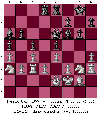 Last move : 1/2-1/2 2008 September 26 3:26:8 [Event "FICGS__CHESS__CLASS_C__000089"] [Site "FICGS"] [Date "2008.08.07"] [Round "1"] [White "Harris,Cal"] [Black "Trigiani,Vincenzo"] [Result "1/2-1/2"] [WhiteElo "1800"] [BlackElo "1700"] 1.e4 e5 2.c4 d6 3.a4 Nc6 4.d3 Nf6 5.b3 Be7 6.f3 O-O 7.Bd2 b6 8.g4 Qd7 9.h3 Ba6 10.Ne2 Ne8 11.Na3 Nf6 12.Bg2 Nb4 13.Bxb4 c5 14.Bxc5 dxc5 15.Ng3 Qd6 16.h4 g6 17.Qd2 Bb7 18.Rc1 Qd4 19.Rc2 Ba6 20.Rc3 Nd7 21.Ke2 Qd6 22.Rh3 Nf6 23.Qe3 Rad8 24.Kd2 Bb7 25.Ke2 Rc8 26.g5 a5 27.gxf6 Bxf6 28.Kf2 Rcd8 29.Ke2 Ba6 30.Kf2 Qe6 31.Qe2 Rfe8 1/2-1/2 King's pawn game Kingside Castling by player Black (move 6) This chess game ended in a draw. Follow this game move after move (download)Different people feel differently about resigning. (Bobby Fischer) Ich habe die Schachforschung dermaßen betrieben, dass sie auf eine wissenschaftliche Basis gestellt wurde. (Mikhail Moiseyevich Botvinik) El hombre es un frívolo, una creatura engañosa y como un jugador de Ajedrez, se preocupa mas por el proceso de obtener su meta que de la meta por sí misma. (Dostoyevsky) La solitude du joueur d'Echecs à l'approche du mat est semblable à celle du condamné. (Francis Szpiner) All men can see these tactics whereby I conquer, but what none can see is the strategy out of which victory is evolved. (Sun Tzu)