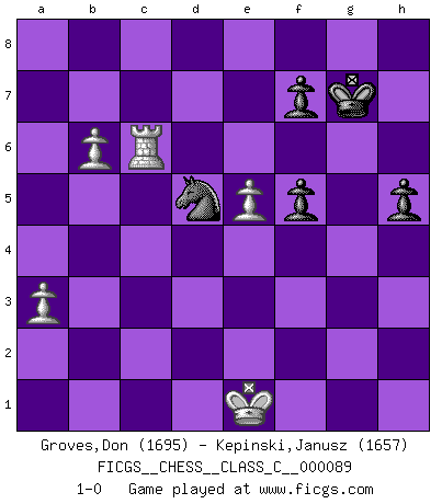 Last move : 1-0 2008 December 3 23:37:40 [Event "FICGS__CHESS__CLASS_C__000089"] [Site "FICGS"] [Date "2008.08.07"] [Round "1"] [White "Groves,Don"] [Black "Kepinski,Janusz"] [Result "1-0"] [WhiteElo "1695"] [BlackElo "1657"] 1.e4 e6 2.d4 d5 3.e5 b6 4.Nf3 Qd7 5.Nc3 Ba6 6.Bxa6 Nxa6 7.a3 c5 8.Qe2 cxd4 9.Nxd4 Nc5 10.O-O Ne7 11.b4 Nb7 12.f4 g6 13.Bb2 Bg7 14.Nd1 Rc8 15.Ne3 O-O 16.Rac1 Nf5 17.Nexf5 exf5 18.Rcd1 Nd8 19.Nb5 a6 20.Nd6 Ra8 21.Rxd5 b5 22.c4 bxc4 23.Qxc4 Qe6 24.Bd4 Qe7 25.Nc8 Qe8 26.Nb6 Rb8 27.Bc5 Ne6 28.Bxf8 Rxb6 29.Rd6 Rxd6 30.Bxd6 Qa4 31.Qc8+ Bf8 32.Qc3 Qb5 33.Bxf8 Kxf8 34.g3 Qb6+ 35.Kg2 Kg7 36.Rd1 Qb7+ 37.Qf3 Qc7 38.Qd3 Qc6+ 39.Kf2 h6 40.Qe3 g5 41.h4 gxf4 42.gxf4 Qc2+ 43.Qe2 Qc3 44.Qxa6 Qh3 45.Rg1+ Kh7 46.Qa7 Qxh4+ 47.Ke2 Qh2+ 48.Ke1 Qh5 49.Qf2 Qh3 50.Qg3 Qxg3+ 51.Rxg3 Nxf4 52.Rc3 Nd5 53.Rc6 Kg7 54.b5 h5 55.b6 1-0 French : Advance variation Kingside Castling by player White (move 10) Kingside Castling by player Black (move 15) 10 pieces endgame at move 51 : White KRPPP , Black KNPPP WHITE : King + 1 Rook 3 Pawns BLACK : King + 1 Knight 3 Pawns Player White won this chess game. Follow this game move after move (download)If one piece is badly posted, the whole game is bad. (Tarrasch) Früher wurde jeder komplizierte Zug, jedes interessante Opfer mit großem Beifall und Enthusiasmus aufgenommen. Heute schaltet man einfach seinen Fritz an, und man kann sehen, was los ist, ob der Zug geht oder nicht. (Vladimir Kramnik) Las leyes del Ajedrez no permiten una libre elección: tienes que mover quieras o no. (Emanuel Lasker) Les Echecs sont et restent toujours un combat, un combat intégral comme la boxe, la lutte ou un autre sport, et où il doit y avoir un vainqueur et un vaincu. (Joseph Emil Diemer) He who laughs last probably does not get the joke. (Unknown)