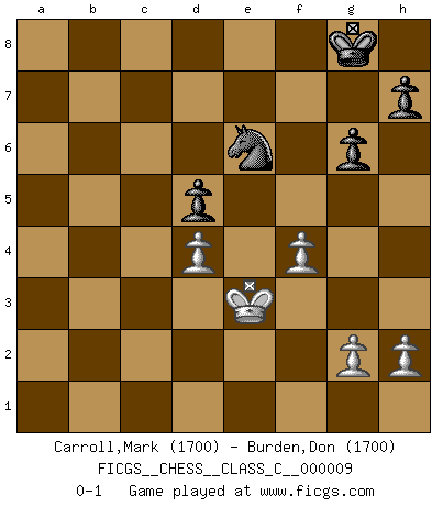 Last move : 0-1 2007 February 23 5:39:4 [Event "FICGS__CHESS__CLASS_C__000009"] [Site "FICGS"] [Date "2006.08.01"] [Round "1"] [White "Carroll,Mark"] [Black "Burden,Don"] [Result "0-1"] [WhiteElo "1700"] [BlackElo "1700"] 1.e4 c5 2.d4 cxd4 3.c3 dxc3 4.Nxc3 Nc6 5.Nf3 e6 6.Bc4 a6 7.O-O Nge7 8.Qe2 Ng6 9.Rd1 Be7 10.Be3 O-O 11.Rac1 b5 12.Bb3 Bb7 13.a3 Rc8 14.Nd2 Na5 15.Ba2 Bf6 16.f4 Bxc3 17.Rxc3 Rxc3 18.bxc3 Qe7 19.a4 Qa3 20.Nb1 Qxa4 21.Rd4 Nc4 22.Bxc4 bxc4 23.Rxc4 Qa1 24.Qc2 Bc6 25.Rb4 a5 26.Rb6 f5 27.exf5 Rxf5 28.Rb8+ Rf8 29.Rxf8+ Nxf8 30.Kf2 d6 31.Qd3 a4 32.Qxd6 Qxb1 33.Qxc6 a3 34.Bd4 a2 35.Qc7 Qc2+ 36.Kf3 Qd3+ 37.Kf2 Qxd4+ 38.cxd4 a1Q 39.Qc4 Qb2+ 40.Kf3 Qb7+ 41.Kf2 Qd5 42.Qxd5 exd5 43.Kf3 Ne6 44.Ke3 g6 0-1 This chess game has been lost on time (started : 2006.08.01 15:15:51) Sicilian : Smith-Morra gambit Kingside Castling by player White (move 7) Kingside Castling by player Black (move 10) Promotion Queen by player Black (move 38) 10 pieces endgame at move 42 : White KPPPP , Black KNPPP WHITE : King + 4 Pawns BLACK : King + 1 Knight 3 Pawns Player Black won this chess game. Follow this game move after move (download)The chessboard is the world, the pieces are the phenomena of the Universe, the rules of the game are what we call the laws of Nature and the player on the other side is hidden from us. (Thomas Huxley) Sehr viele beherrschen heutzutage das große Einmalseins des Schachspiels und kennen sogar dessen Logarithmentafeln auswendig - deshalb sollte man hin und wieder zu beweisen trachten, dass zwei mal zwei auch fünf sein kann. (Mikhail Nekhemyevich Tal) El Ajedrez es un regaderazo frío para la mente. (Sir John Simon) Je crois qu'il existe des manières très spécifiques de jouer efficacement contre une machine. Evidemment, nous n'avons aucune chance en technique pure, parce que l'ordinateur calcule de manière parfaite. Mais lorsque nous faisons appel à notre cerveau, en utilisant l'intuition et la compréhension, alors nous restons beaucoup plus forts. (Anatoli Karpov) To steal ideas from one person is plagiarism. To steal from many is research. (Unknown)