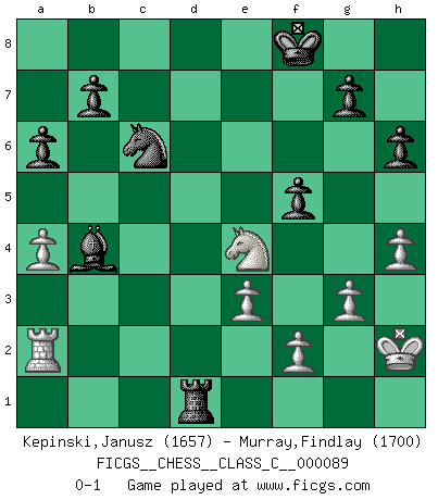 Last move : 0-1 2008 October 9 17:15:18 [Event "FICGS__CHESS__CLASS_C__000089"] [Site "FICGS"] [Date "2008.08.07"] [Round "1"] [White "Kepinski,Janusz"] [Black "Murray,Findlay"] [Result "0-1"] [WhiteElo "1657"] [BlackElo "1700"] 1.d4 d5 2.c4 dxc4 3.Nf3 Nf6 4.e3 e6 5.Bxc4 c5 6.O-O a6 7.a4 Nc6 8.Nc3 Be7 9.Re1 O-O 10.dxc5 Bxc5 11.Qc2 Qe7 12.b3 e5 13.Bb2 Bg4 14.Be2 Rfd8 15.Rad1 Bb4 16.h3 Bh5 17.Nh2 Bxe2 18.Rxe2 Rxd1+ 19.Nxd1 Rd8 20.Nf3 e4 21.Bxf6 Qxf6 22.Nh2 Qe6 23.Nf1 Rd3 24.Ng3 Qxb3 25.Qxb3 Rxb3 26.Nxe4 Rb1 27.Kh2 Rxd1 28.Ra2 Kf8 29.g3 h6 30.h4 f5 0-1 QGA : Classical, Rubinstein variation Kingside Castling by player White (move 6) Kingside Castling by player Black (move 9) Player Black won this chess game. Follow this game move after move (download)When you absolutely don't know what to do anymore, it is time to panic. (John van der Wiel) Du musst Deinen Gegner in einen tiefen dunklen Wald führen wo 2+2=5 ist und wo der Weg, der wieder hinausführt, nur breit genug für einen ist. (Mikhail Nekhemyevich Tal) Los Peones son el alma de una partida de Ajedrez. (Francois Andre Danican Philidor) Il n'y a plus de joueurs du niveau de Jacob Murray dont la seule quête est le beau jeu, le plaisir de voir les pièces construire quelque chose. Sur 10 idées à la minute, 9 seront sans intérêt, la dernière s'avèrera géniale. (Christian Bauer) Never risk one's whole fortune unless supported by one's entire army. (Niccolo Machiavelli)