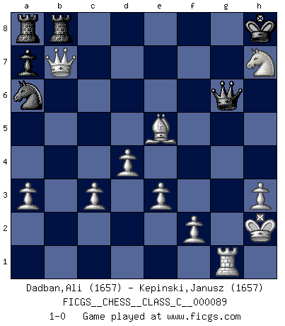 Last move : 1-0 2008 September 20 17:50:44 [Event "FICGS__CHESS__CLASS_C__000089"] [Site "FICGS"] [Date "2008.08.07"] [Round "1"] [White "Dadban,Ali"] [Black "Kepinski,Janusz"] [Result "1-0"] [WhiteElo "1657"] [BlackElo "1657"] 1.d4 Nf6 2.c4 e6 3.Nf3 d5 4.Nc3 Bb4 5.Bg5 c5 6.cxd5 exd5 7.e3 O-O 8.a3 Ba5 9.Bd3 c4 10.Bc2 h6 11.Bh4 Bxc3+ 12.bxc3 Bg4 13.h3 Bh5 14.g4 Bg6 15.Bxg6 fxg6 16.g5 Ne4 17.gxh6 Qa5 18.O-O gxh6 19.Ne5 Kg7 20.Qg4 Qb6 21.Rab1 Qa6 22.Rxb7+ Qxb7 23.Qxg6+ Kh8 24.Qxh6+ Kg8 25.Kh2 Ng3 26.Bxg3 Qg7 27.Qe6+ Kh7 28.Qxd5 Na6 29.Qxc4 Qf6 30.Qd3+ Kg7 31.Ng4 Qg6 32.Be5+ Kf7 33.Qb5 Kg8 34.Qd5+ Kh7 35.Qb7+ Kg8 36.Rg1 Rfb8 37.Nf6+ Kh8 38.Nh7 1-0 Queen's pawn game Kingside Castling by player Black (move 7) Kingside Castling by player White (move 18) Player White won this chess game. Follow this game move after move (download)You are for me the Queen on d8 and I am the Pawn on d7 !! (Eduard Gufeld) Kombinieren und Schwarzhandel gehören verboten. (Savielly Grigorievitsch Tartakower) EL Ajedrez es como la vida. (Boris Spassky) Un millionnaire : 'Monsieur Steinitz ! Vous ne participez aux tournois que pour l'argent, alors que moi je n'y viens que pour l'honneur.' Steinitz : 'Chacun joue pour ce qu'il n'a pas'... The only sure thing about luck is that it will change. (Wilson Mizner)
