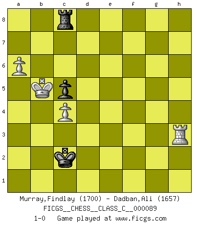 Last move : 1-0 2008 August 24 19:46:52 [Event "FICGS__CHESS__CLASS_C__000089"] [Site "FICGS"] [Date "2008.08.07"] [Round "1"] [White "Murray,Findlay"] [Black "Dadban,Ali"] [Result "1-0"] [WhiteElo "1700"] [BlackElo "1657"] 1.e4 d6 2.d4 Nf6 3.Nc3 g6 4.f4 Bg7 5.Nf3 c5 6.Bb5+ Bd7 7.e5 Ng4 8.e6 fxe6 9.Ng5 Bxb5 10.Nxe6 Bxd4 11.Nxb5 Qa5+ 12.Qd2 Bf2+ 13.Kd1 Ne3+ 14.Ke2 Qxb5+ 15.Kxf2 Ng4+ 16.Kg3 Na6 17.Re1 Nh6 18.Kf2 Nf5 19.g4 Nd4 20.Nxd4 cxd4 21.Qxd4 Qc5 22.Qxc5 Nxc5 23.Be3 Rc8 24.Bxc5 Rxc5 25.Re2 O-O 26.Kg3 Rc7 27.Rae1 Kf7 28.c3 Rfc8 29.h4 h5 30.gxh5 gxh5 31.Re6 Rg8+ 32.Kh3 Rg4 33.Rh6 Rxf4 34.Rxh5 Rf2 35.Rb5 b6 36.Kg3 Rf6 37.h5 Rc5 38.Rxc5 dxc5 39.Rh1 Kg7 40.Rh2 Kh6 41.Kg4 Rf1 42.Re2 Rg1+ 43.Kf5 Rg5+ 44.Ke6 Rxh5 45.Kxe7 Rf5 46.c4 Kg5 47.b3 Kg4 48.Kd6 Rf6+ 49.Kc7 Rf7+ 50.Kc6 Kf3 51.Rd2 Ke3 52.Rd7 Rf6+ 53.Kb5 a5 54.Rb7 Kd4 55.Rxb6 Rf2 56.a4 Rf5 57.Kxa5 Kc3 58.Rh6 Kxb3 59.Kb5 Rf8 60.Rh3+ Kc2 61.a5 Rc8 62.a6 1-0 Pirc : Austrian attack, Dragon formation Kingside Castling by player Black (move 25) 10 pieces endgame at move 45 : White KRPPP , Black KRPPP WHITE : King + 1 Rook 3 Pawns BLACK : King + 1 Rook 3 Pawns 9 pieces endgame at move 55 : White KRPPP , Black KRPP WHITE : King + 1 Rook 3 Pawns BLACK : King + 1 Rook 2 Pawns 8 pieces endgame at move 57 : White KRPPP , Black KRP WHITE : King + 1 Rook 3 Pawns BLACK : King + 1 Rook 1 Pawn 7 pieces endgame at move 58 : White KRPP , Black KRP WHITE : King + 1 Rook 2 Pawns BLACK : King + 1 Rook 1 Pawn Player White won this chess game. Follow this game move after move (download)What would Chess be without silly mistakes ? (Kurt Richter) Wenn ich einen Club besuche, sind die Spieler stumm vor Staunen. (José Raúl Capablanca) Nos gusta pensar. (Gary Kasparov) A ce moment-là, je menaçais de comprendre la position ! (Clément L'Heureux) Be who you are, and say what you feel because those who mind don't matter, and those who matter don't mind. (Dr Seuss)