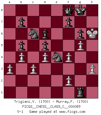 Last move : 0-1 2008 August 25 23:46:0 [Event "FICGS__CHESS__CLASS_C__000089"] [Site "FICGS"] [Date "2008.08.07"] [Round "1"] [White "Trigiani,Vincenzo"] [Black "Murray,Findlay"] [Result "0-1"] [WhiteElo "1700"] [BlackElo "1700"] 1.d4 d5 2.Bf4 Nf6 3.Nc3 e6 4.Nb5 Bd6 5.Nxd6+ cxd6 6.c3 O-O 7.Nf3 Re8 8.e3 Nc6 9.Bd3 e5 10.O-O exf4 11.exf4 Bg4 12.a3 Qd7 13.h3 Bf5 14.Bb5 a6 15.b4 axb5 16.Qe2 Rxe2 17.Rfe1 Rxe1+ 18.Rxe1 Re8 19.g4 Rxe1+ 20.Kg2 Be4 21.Kg3 Bxf3 22.Kxf3 Qe7 23.Kg3 Rg1+ 24.Kh4 Ne4 25.g5 h6 26.Kh5 g6+ 27.Kxh6 Qf8+ 0-1 Queen's pawn, Mason variation Kingside Castling by player Black (move 6) Kingside Castling by player White (move 10) Player Black won this chess game. Follow this game move after move (download)I give 98 percent of my mental energy to Chess. Others give only 2 percent. (Bobby Fischer) Gegen einen Schachcomputer zu verlieren ist wie Löcher in den Strümpfen zuhaben. Es ist nicht peinlich, solange man der einzige ist der es weiß. (Anonymous) El arma más poderosa en el Ajedrez, es tener la próxima movida. (David Bronstein) Les erreurs sont comme les malheurs, elles n'arrivent jamais seules. (Siegbert Tarrasch) When you don't know what to do, walk fast and look worried. (Anonymous)