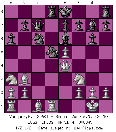 Last move : 1/2-1/2 2008 October 20 2:21:41 [Event "FICGS__CHESS__RAPID_A__000049"] [Site "FICGS"] [Date "2008.08.08"] [Round "1"] [White "Vasquez,Fernando"] [Black "Bernal Varela,Nelson"] [Result "1/2-1/2"] [WhiteElo "2060"] [BlackElo "2078"] 1.e4 c5 2.d4 cxd4 3.c3 Nf6 4.e5 Nd5 5.Nf3 Nc6 6.cxd4 d6 7.Bc4 dxe5 8.dxe5 Be6 9.O-O g6 10.Qe2 Qc7 11.Rd1 Rd8 12.Na3 a6 13.Qe4 Bf5 14.Qe2 Be6 15.Bb3 Bg7 16.Qe4 Bf5 17.Qh4 Be6 18.Qe4 Bf5 19.Qe2 Be6 20.Qe4 1/2-1/2 Sicilian : Smith-Morra gambit Kingside Castling by player White (move 9) This chess game ended in a draw. Follow this game move after move (download)Chess is imagination. (David Bronstein) Fischer: 'Remis!?' Uhlmann: 'Aber es muss doch dreimal Zugwiederholung sein!' Fischer: 'Sie nehmen das Remis an, wie ich es sage, sonst spiele ich weiter und werde Sie dann schlagen!' (Robert James Fischer) Las leyes del Ajedrez no permiten una libre elección: tienes que mover quieras o no. (Emanuel Lasker) Avant la finale, les dieux ont créé le milieu de partie. (Tarrasch) Are you threatening me, Master Jedi ? (Chancellor Palpatine in Star Wars ep.3)