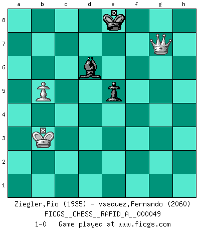 Last move : 1-0 2008 December 22 21:45:17 [Event "FICGS__CHESS__RAPID_A__000049"] [Site "FICGS"] [Date "2008.08.08"] [Round "1"] [White "Ziegler,Pio"] [Black "Vasquez,Fernando"] [Result "1-0"] [WhiteElo "1935"] [BlackElo "2060"] 1.d4 d5 2.Nf3 Nf6 3.c4 dxc4 4.e3 Be6 5.Nc3 c6 6.Ng5 Bd5 7.e4 h6 8.exd5 hxg5 9.dxc6 Nxc6 10.d5 Ne5 11.Bxg5 Qb6 12.Bxc4 Nxc4 13.Qa4+ Nd7 14.Qxc4 Qg6 15.Be3 Qxg2 16.O-O-O f6 17.Qc7 Rd8 18.Qxb7 Rxh2 19.Rhe1 Ne5 20.Bf4 Qxf2 21.Bxh2 Qxh2 22.Qxa7 Qf4+ 23.Kb1 Qf5+ 24.Ka1 Kf7 25.Qb6 Rd6 26.Qb3 Rd7 27.Ne4 Kg8 28.Nc5 Rd6 29.Nb7 Rd7 30.d6 Nf7 31.dxe7 Bxe7 32.Rxd7 Qxd7 33.Qe6 Qxe6 34.Rxe6 Bb4 35.a3 Bd2 36.a4 Ne5 37.a5 Kf7 38.Nd8+ Kf8 39.b4 Be1 40.Rxe5 fxe5 41.a6 Ke7 42.a7 Kxd8 43.a8Q+ Ke7 44.b5 Bc3+ 45.Ka2 Bb4 46.Qb7+ Ke8 47.Qxg7 Bd6 48.Kb3 1-0 Queen's pawn game Queenside Castling by player White (move 16) 10 pieces endgame at move 34 : White KRNPP , Black KBNPP WHITE : King + 1 Rook 1 Knight 2 Pawns BLACK : King + 1 Bishop 1 Knight 2 Pawns 9 pieces endgame at move 40 : White KRNPP , Black KBPP WHITE : King + 1 Rook 1 Knight 2 Pawns BLACK : King + 1 Bishop 2 Pawns 8 pieces endgame at move 40 : White KNPP , Black KBPP WHITE : King + 1 Knight 2 Pawns BLACK : King + 1 Bishop 2 Pawns 7 pieces endgame at move 42 : White KPP , Black KBPP WHITE : King + 2 Pawns BLACK : King + 1 Bishop 2 Pawns Promotion Queen by player White (move 43) 6 pieces endgame at move 47 : White KQP , Black KBP WHITE : King + 1 Queen 1 Pawn BLACK : King + 1 Bishop 1 Pawn Player White won this chess game. Follow this game move after move (download)The beauty of a move lies not in its' appearance but in the thought behind it. (Siegbert Tarrasch) Um dein Spiel zu verbessern musst du zuallererst das Endspiel studieren, denn diese kann unabhängig studiert werden. Die Eröffnung und das Mittelspiel müssen immer in Bezug gesetzt werden zum Endspiel. (José Raúl Capablanca) Fischer es el jugador mas fuerte del mundo. De hecho, el jugador mas fuerte que jamas haya existido. (Larry Evans) Le profane ne songe pas à la somme de jouissance dont il se prive, qui méconnaît ce jeu aux ressources aussi variées que passionnantes. (Jean-Marie Jeanton-Lamarche) Control your own destiny or someone else will. (Jack Welch)