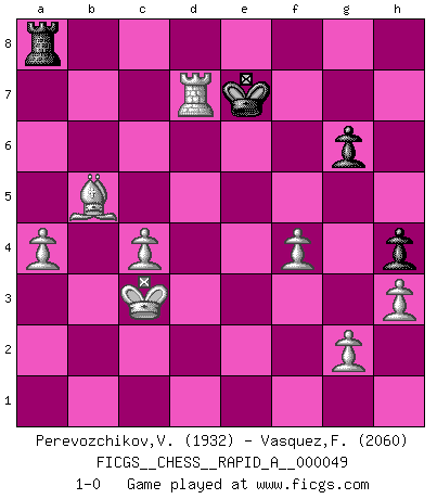 Last move : 1-0 2008 December 31 16:53:1 [Event "FICGS__CHESS__RAPID_A__000049"] [Site "FICGS"] [Date "2008.08.08"] [Round "1"] [White "Perevozchikov,Vjacheslav"] [Black "Vasquez,Fernando"] [Result "1-0"] [WhiteElo "1932"] [BlackElo "2060"] 1.e4 e5 2.Nf3 Nf6 3.Nxe5 d6 4.Nf3 Nxe4 5.d4 d5 6.Bd3 Nc6 7.O-O Be7 8.c4 Nb4 9.Be2 O-O 10.Nc3 Bf5 11.a3 Nxc3 12.bxc3 Nc6 13.Re1 Re8 14.Bf4 Bd6 15.Bxd6 Qxd6 16.Qb3 Be4 17.c5 Qd8 18.Qxb7 Re6 19.Ng5 Rh6 20.Nxe4 Rb8 21.Qa6 dxe4 22.Bg4 Nxd4 23.Qxa7 Nc6 24.Qa4 Qh4 25.h3 Rb2 26.Re2 Rxe2 27.Bxe2 Qe7 28.Bb5 Qe8 29.Re1 Re6 30.Bc4 Re5 31.f4 Rxc5 32.Rxe4 Qb8 33.Qd1 h6 34.Qd3 Na5 35.Bd5 Nc6 36.c4 Qd8 37.Qe3 Qd6 38.Re8+ Kh7 39.Bxf7 Qd4 40.Bg8+ Kh8 41.Bd5 Kh7 42.Kf2 Qxe3+ 43.Kxe3 g6 44.Re6 Na5 45.Kd4 Nb3+ 46.Kc3 Nc1 47.Re7+ Kh8 48.Re3 Ra5 49.Kc2 Ra4 50.Kxc1 c6 51.Be6 Kg7 52.Kb2 Ra8 53.Bd7 c5 54.a4 Ra7 55.Bc6 Ra6 56.Bb5 Ra8 57.Re5 Kf6 58.Rxc5 h5 59.Rd5 h4 60.Kc3 Ke7 61.Rd7+ 1-0 This chess game has been lost on time (started : 2008.08.08 12:57:46) Petrov : Classical attack Kingside Castling by player White (move 7) Kingside Castling by player Black (move 9) Player White won this chess game. Follow this game move after move (download)Every Pawn is a potential Queen. (James Mason) Nur ein wirklich starker Spieler weiß wie schwach er spielt. (Savielly Grigorievitsch Tartakower) Todos los jugadores de Ajedrez deberían tener un pasatiempo. (Savielly Tartakower) C'est la seule position que je connaisse où les deux camps sont mals. Propos prêtés à V. Anand. If passion drives you, let reason holds the reins. (Benjamin Franklin)