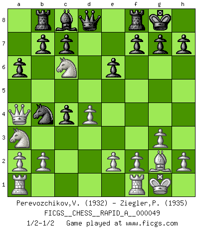 Last move : 1/2-1/2 2008 August 16 10:28:15 [Event "FICGS__CHESS__RAPID_A__000049"] [Site "FICGS"] [Date "2008.08.08"] [Round "1"] [White "Perevozchikov,Vjacheslav"] [Black "Ziegler,Pio"] [Result "1/2-1/2"] [WhiteElo "1932"] [BlackElo "1935"] 1.d4 Nf6 2.c4 e6 3.Nf3 d5 4.g3 dxc4 5.Bg2 Nc6 6.Qa4 Bb4+ 7.Bd2 Nd5 8.Bxb4 Ndxb4 9.O-O Rb8 10.Na3 a6 11.Ne5 O-O 12.Nxc6 1/2-1/2 Queen's pawn game Kingside Castling by player White (move 9) Kingside Castling by player Black (move 11) This chess game ended in a draw. Follow this game move after move (download)Chess is a terrible game. If you have no center, your opponent has a freer position. If you do have a center, then you really have something to worry about ! (Siegbert Tarrasch) Wie kann ich Remis annehmen? Ich weiß ja gar nicht, wie ich stehe! (Fritz Sämisch) No soy una persona materialista y por eso, no resiento la falta o pérdida del dinero. La ausencia de cosas mundanas carece de importancia. Ya que el Ajedrez es una forma en la que puedo ser tan materialista como yo desee sin tener la necesidad de vender mi alma. (Jamie Walter Adams) A ce moment-là, je menaçais de comprendre la position ! (Clément L'Heureux) Experiences are the keys to life. (Daniel Parmet)