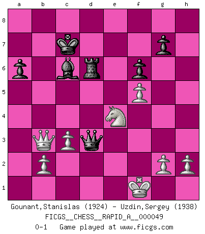Last move : 0-1 2008 November 21 9:22:56 [Event "FICGS__CHESS__RAPID_A__000049"] [Site "FICGS"] [Date "2008.08.08"] [Round "1"] [White "Gounant,Stanislas"] [Black "Uzdin,Sergey"] [Result "0-1"] [WhiteElo "1924"] [BlackElo "1938"] 1.e4 c5 2.Nc3 Nc6 3.Nf3 e6 4.d4 cxd4 5.Nxd4 Qc7 6.f4 a6 7.Nb3 b5 8.Bd3 Bb7 9.Be3 Nf6 10.O-O d6 11.Qf3 Be7 12.Qh3 h5 13.a4 b4 14.Nd1 Na5 15.f5 e5 16.Nf2 d5 17.Nxa5 Qxa5 18.exd5 Qxd5 19.Rad1 Qc6 20.Bg5 Qc5 21.Rde1 Qc7 22.Bh4 O-O-O 23.Kh1 Rd4 24.Re2 Kb8 25.Bg3 Bd6 26.Rfe1 Re8 27.Bh4 Nd5 28.Bg5 Be7 29.Rxe5 f6 30.Qxh5 Qd8 31.Rxd5 Bxd5 32.Bh4 Bc6 33.Bg3 Bd6 34.Rxe8 Bxe8 35.Bxd6+ Rxd6 36.Qg4 b3 37.c3 Bc6 38.Qg3 Qe7 39.Kg1 Kb7 40.Kf1 Bxa4 41.Qf4 Bc6 42.Qb4+ Kc7 43.Qxb3 Qe3 44.Ne4 Qxd3+ 0-1 Sicilian : Closed, 2...Nc6 Kingside Castling by player White (move 10) Queenside Castling by player Black (move 22) Player Black won this chess game. Follow this game move after move (download)A strong memory, concentration, imagination, and a strong will is required to become a great Chess player. (Bobby Fischer) Vielleicht wirkt die Aura früherer Spieler glanzvoller als die der heutigen Spieler, aber das liegt daran, dass man kein Programm wie Fritz hatte, das einem all die Löcher in ihren Partien zeigt. (Vladimir Kramnik) Jugadores de primera clase pierden en contra de jugadores de segunda clase porque los jugadores de segunda clase a veces juegan una partida de primer clase. (Siegbert Tarrasch) Les erreurs sont comme les malheurs, elles n'arrivent jamais seules. (Siegbert Tarrasch) Treat your password like your toothbrush. Don't let anybody else use it, and get a new one every six months. (Clifford Stoll)