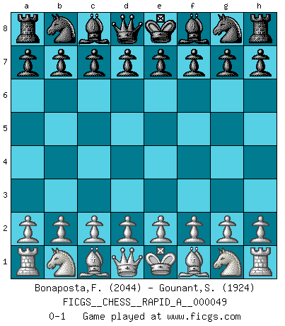 Last move : 0-1 2008 September 7 20:51:59 [Event "FICGS__CHESS__RAPID_A__000049"] [Site "FICGS"] [Date "2008.08.08"] [Round "1"] [White "Bonaposta,Fabrizio"] [Black "Gounant,Stanislas"] [Result "0-1"] [WhiteElo "2044"] [BlackElo "1924"] 0-1 This chess game has been lost on time (started : 2008.08.08 12:57:46) Player Black won this chess game. Follow this game move after move (download)A man that will take back a move at Chess will pick a pocket. (Richard Fenton) Heutzutage gewinnt im Turnier nicht derjenige Spieler, der weitreichende Pläne entwirft, sondern einfach jener, der Zug um Zug kämpft. (David Bronstein) Fischer es el jugador mas fuerte del mundo. De hecho, el jugador mas fuerte que jamas haya existido. (Larry Evans) Même si vous avez un bon coup à faire, regardez toujours s'il n'y en a pas un qui lui soit préférable. (Pedro Damiano) History is the quarrels of popes and kings, with wars or pestilences in every page; the men all so good for nothing, and hardly any women at all. (Jane Austen)