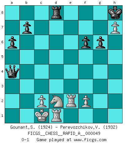 Last move : 0-1 2008 November 15 11:23:28 [Event "FICGS__CHESS__RAPID_A__000049"] [Site "FICGS"] [Date "2008.08.08"] [Round "1"] [White "Gounant,Stanislas"] [Black "Perevozchikov,Vjacheslav"] [Result "0-1"] [WhiteElo "1924"] [BlackElo "1932"] 1.e4 c5 2.Nc3 d6 3.Nf3 Nf6 4.Bc4 e6 5.Bb5+ Bd7 6.Bxd7+ Qxd7 7.d4 cxd4 8.Qxd4 Nc6 9.Qd3 Be7 10.Bf4 Rd8 11.O-O-O O-O 12.h4 a6 13.Qe2 d5 14.h5 h6 15.g4 d4 16.g5 hxg5 17.h6 g6 18.Be3 e5 19.Bxg5 Nb4 20.Kb1 Qe6 21.Nd5 Nbxd5 22.exd5 Rxd5 23.Rhe1 Bb4 24.Bxf6 Qxf6 25.Qe4 Rb5 26.a4 Rb6 27.Re2 Bc3 28.b3 Rb4 29.Nd2 Rc8 30.Qg4 Qd8 31.Qh3 d3 32.Qxd3 Rd4 33.h7+ Kh8 34.Qe3 Qd6 35.Ka2 Qc6 36.Kb1 Rcd8 37.Qxe5+ f6 38.Qg3 Rxa4 39.Qxc3 Qxc3 40.bxa4 Qb4+ 41.Kc1 Qxa4 0-1 Sicilian : Closed Queenside Castling by player White (move 11) Kingside Castling by player Black (move 11) Player Black won this chess game. Follow this game move after move (download)We must make sure that Chess will not be like a dead language, very interesting, but for a very small group. (Sytze Faber) Ein guter Spieler hat immer Glück. (José Raúl Capablanca) No es suficiente ser un buen jugador, se debe también de jugar bién. (Siegbert Tarrasch) Il n'y a pas eu de défaite parce que je ne crois pas que cet ordinateur ait jamais existé. IBM a triché en refusant d'imprimer les modes de recherche de la machine. C'est évident, pendant le match, des coups décisifs ont été joués par des êtres humains. Aujourd'hui, les meilleurs spécialistes en informatique ne peuvent toujours pas expliquer comment Deep-Blue a pu jouer contre la logique des ordinateurs. IBM a gagné une guerre de communication, mais ils sont incapables de prouver que l'ordinateur a gagné tout seul. (Garry Kasparov) I couldn't make any sense out of what this particular thread is about. It sounds like R2 D2 computer speaking. A space fight ?!? Some 'command' problems in Moscow ? Some killers & narcotic addicts attacking some game & a god wannabe ?? (Dinesh De Silva, lost in a russian conflict in FICGS forum)
